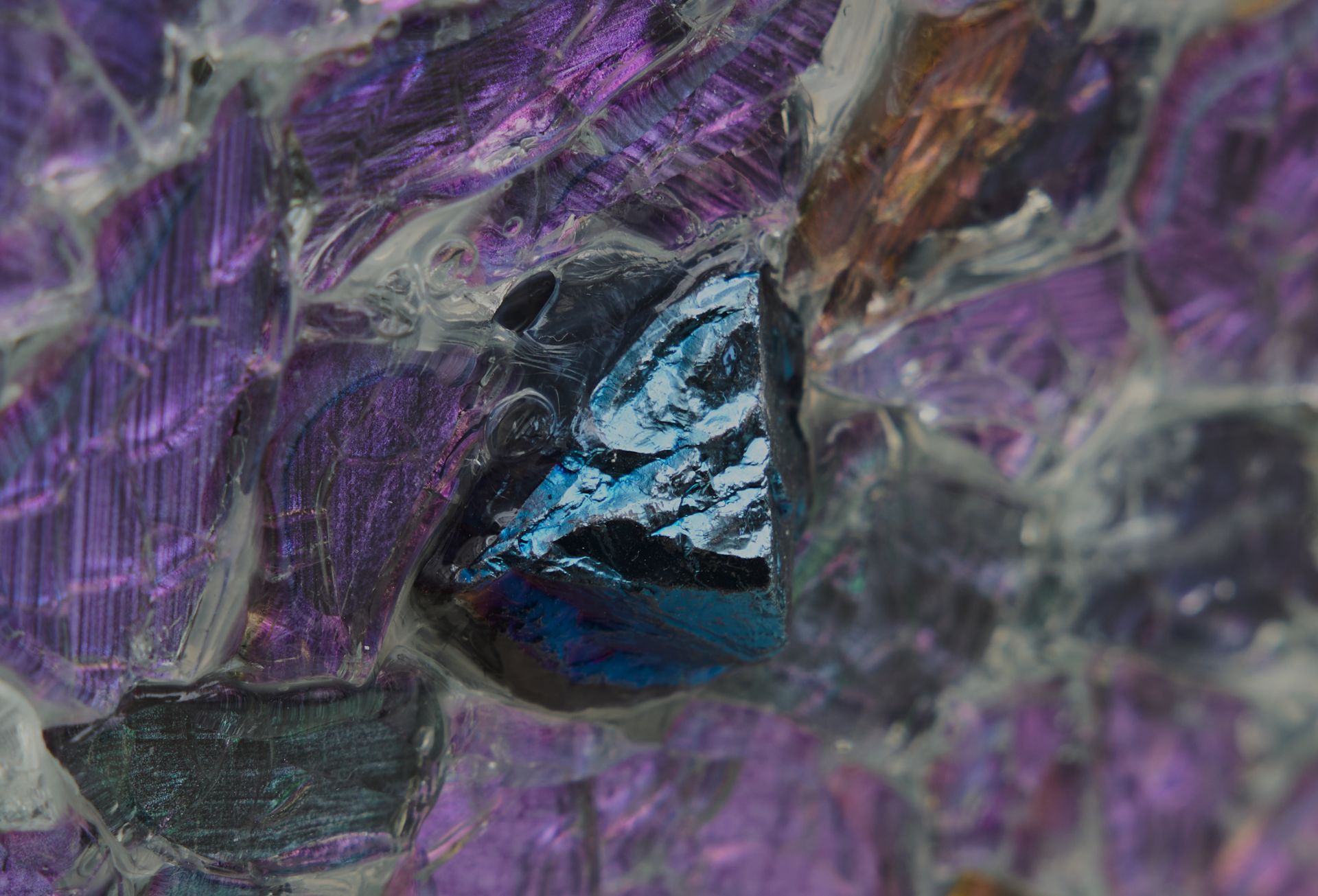 Accanto a Fontana, le superfici iridescenti di Gumby in vetro e resina si offrono come paesaggi stellari, ispirati all’astrofisica e alla fotografia interstellare. La sua pittura tattile e stratificata diventa esperienza sensoriale: ogni pennellata e ogni gesto dell’artista sono registri tangibili di un processo che mette al centro il contatto diretto con la materia. In entrambe le pratiche, il processo stesso è contenuto e significato, un principio che unisce linguaggi diversi attraverso il tempo.