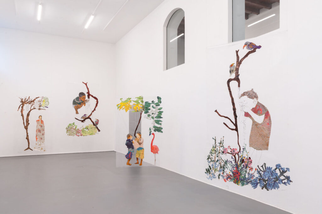 Intervenendo su questi pattern attraverso il ricamo, l’artista introduce un’interruzione, un respiro. Il gesto manuale reinscrive il tessuto industriale in un ecosistema più ampio in cui la sostenibilità non è soltanto una questione ambientale, ma anche culturale e sociale. Sostenere significa prendersi cura, rattoppare, prolungare la vita di ciò che sembrava destinato allo scarto. Inoltre il disegno libero, i fili a vista e l’assenza di una finitura contribuiscono a rafforzare il rifiuto di un’identità fissa o di un’unica narrazione: le figure sono corpi in costruzione.