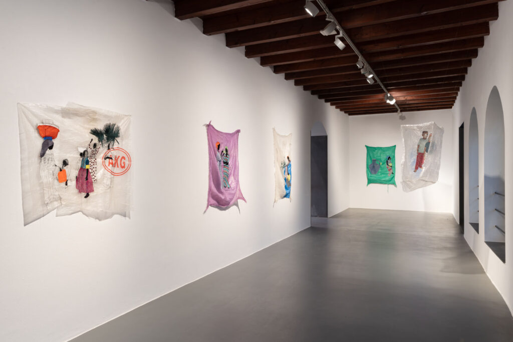 Questi sacchi, colmi di vestiti ma legati anche a storie e a percorsi invisibili, vengono sottratti alla loro funzione originaria e riconfigurati come superfici narrative: anche in questo caso l’artista interviene attraverso ricami e cuciture, incorporando figure umane, scene di vita quotidiana e motivi simbolici che rimandano alla vita sociale, all’infanzia, alla cura e alla trasmissione della memoria.