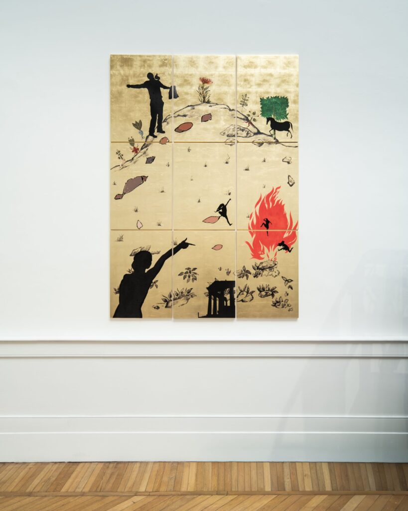I 2 collage inediti The Creation of a Context (foglia oro, collage, tecnica mista su tavola) intrecciano parola e immagine: i testi, generati nei laboratori con diverse comunità, emergono come condensazioni di esperienza su superfici stratificate.