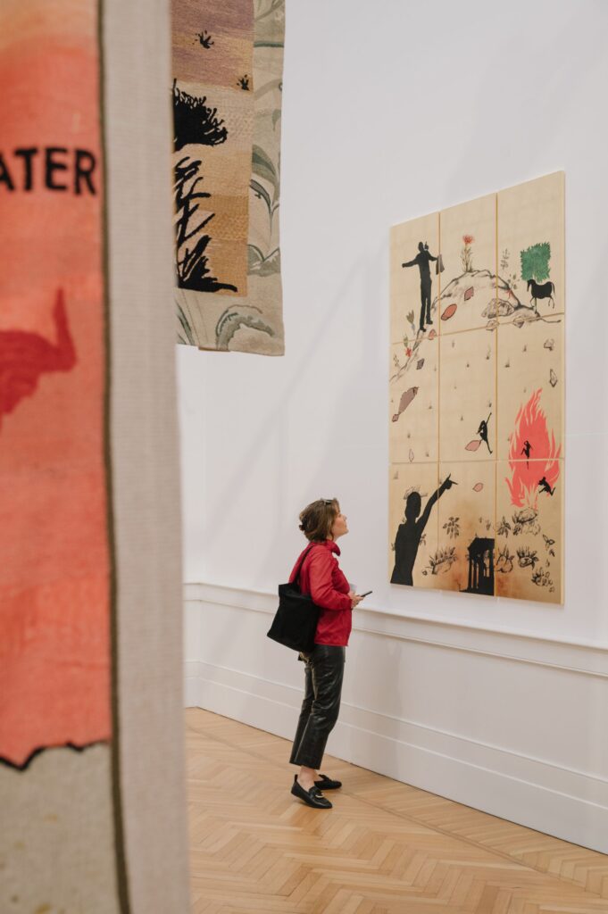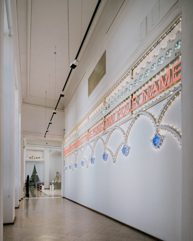 Nucleo centrale della sala sono i 4 arazzi monumentali inediti The Theatre of Commons (ciascuno 300 x 200 cm), realizzati con la Chanakya School of Craft di Mumbai. In queste opere la tessitura diventa costruzione di autonomia e identità: ogni filo è traccia di un passaggio, ogni livello il risultato di una negoziazione tra gesto individuale e dimensione collettiva. L’arazzo condensa tradizione e contemporaneità, individualità e collettività. Nel percorso del museo completa l’allestimento la scultura luminosa Remember The First Time You Saw Your Name (2021, lampadine a led e flex led su struttura in legno, 282 x 1198 cm), cifra distintiva della poetica dell’artista.