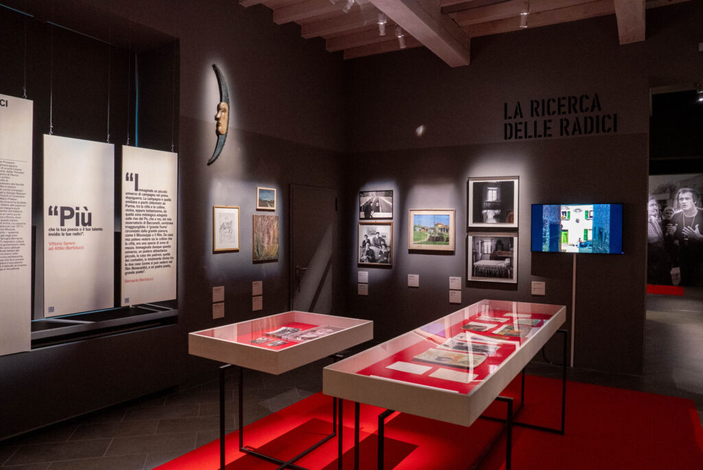 L’esposizione è anche un tributo al territorio e al genius loci di Parma e della sua provincia, terra natale di una famiglia geniale: da San Prospero Parmense, che aveva dato i natali al padre di Bernardo, Attilio, poeta e intellettuale imprescindibile del Novecento nostrano, al Convitto nazionale Maria Luigia, dove Attilio incontra un altro futuro artista capitale, Cesare Zavattini, fino ai luoghi del centro di Parma – inclusi il Liceo classico Romagnosi e l’Università – che hanno coronato l’unione con la moglie Ninetta Giovanardi, madre dei due artisti. Un capitolo a sé è dedicato alle dimore dei Bertolucci presso Baccanelli, dove Bernardo ha trascorso la sua infanzia, e presso Casarola, dove si trova la casa di famiglia, di proprietà della Fondazione Bernardo Bertolucci e parte di un parco letterario consacrato ai legami d’arte, oltre che di sangue, di una gens fondamentale per le sorti delle arti italiane del XX secolo. Luoghi e paesaggi sostrato per l’invenzione di un film epico sul mondo contadino quale è Novecento, rappresentato iconicamente nei titoli di testa dal dipinto Quarto Stato di Giuseppe Pellizza da Volpedo, artista che apre la mostra.