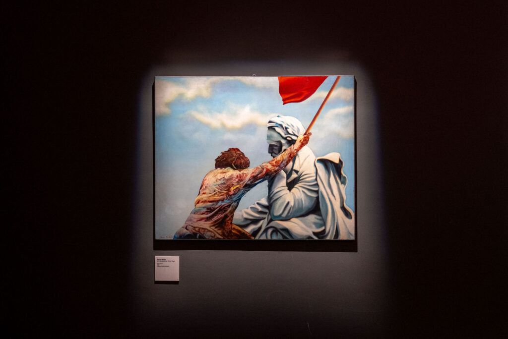 Il visitatore viene così guidato nella genesi del film e nella sua eredità artistica, attraverso materiali inediti – si aprono per la prima volta gli archivi e saranno esposte centinaia di foto mai viste e materiali di lavoro –, testimonianze d’epoca e capolavori pittorici, tra cui opere di Lucio Fontana, Mario Schifano, Franco Mulas, Renato Guttuso, Salvo, Franco Angeli, Giulio Turcato, Alighiero Boetti. Tutti riuniti in una sola sala, insieme, a ricordare la bandiera rossa della scena finale: la più grande bandiera rossa che si sia mai vista in un film, composta con dozzine di drappi e vessilli più piccoli e dalle sfumature più varie. Un modo scenografico, attraverso i soggetti dei quadri esposti, per celebrare un’opera che ha segnato profondamente la storia del cinema moderno e che rappresenta, ancora oggi, una chiave di lettura universale della storia sociale, politica e culturale del nostro Paese.