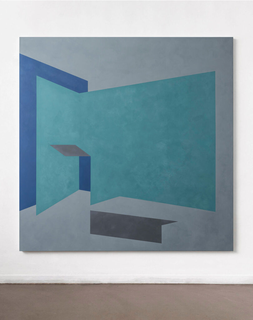Questa dispersione delle traiettorie spaziali trova un’ulteriore declinazione nelle opere pittoriche Modulo pinto (2026), dove le campiture cromatiche seguono partiture geometriche solo apparentemente stabili. Il colore non ordina lo spazio, lo rende instabile, alludendo a possibili ambienti sghembi, a scenari che oscillano tra progetto e rovina. In questo scarto prospettico si concentra il nucleo concettuale della mostra: una tensione irrisolta tra utopia e distopia, tra costruzione e disfacimento.