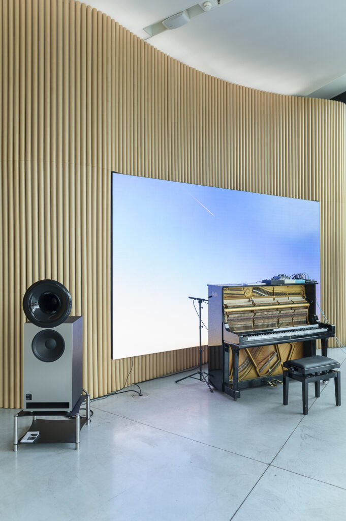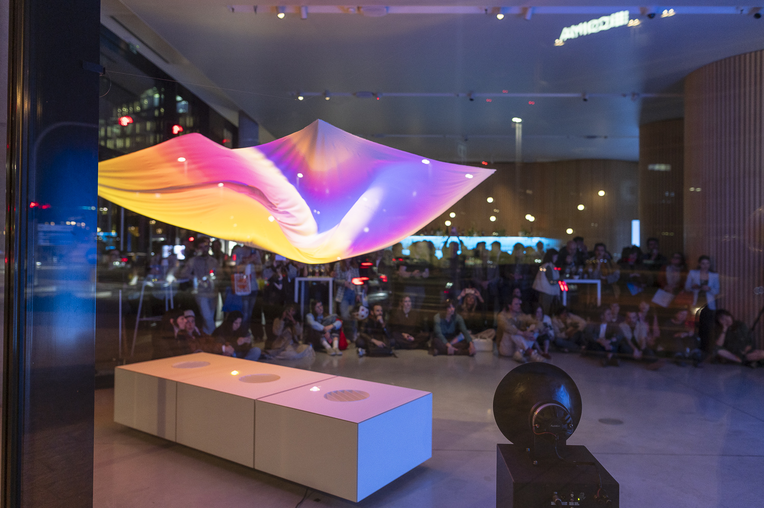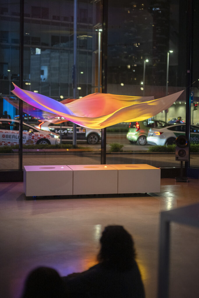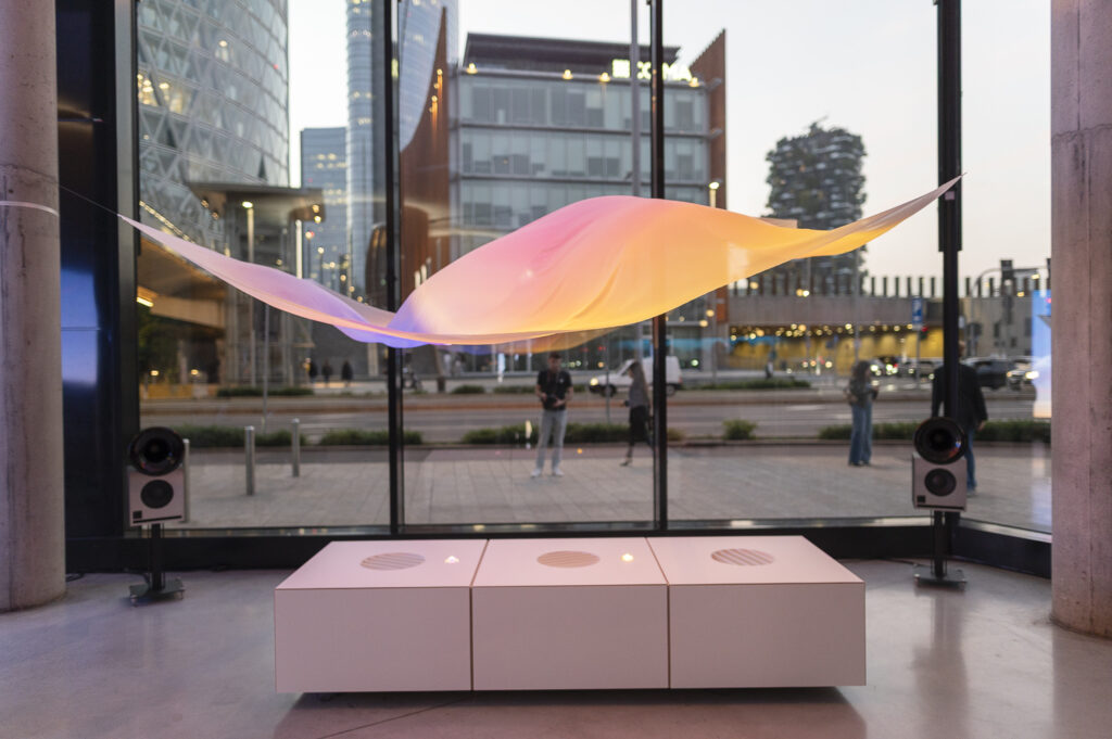 Accompagnata da immagini del mondo naturale “BREATH” interviene in modo completo sul nostro orizzonte sensoriale. A completare l’esperienza, “In/Out”, composizione sonora di Luca Longobardi – pianista e compositore multimediale – che nasce come estensione sensibile di “BREATH”. Il suono prende forma a partire dall’aria stessa: dal respiro meccanico delle ventole che attivano il tessuto, trasformato in materia acustica e rielaborato all’interno di una struttura generativa.