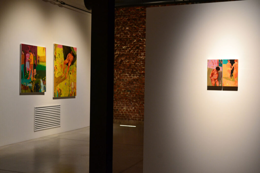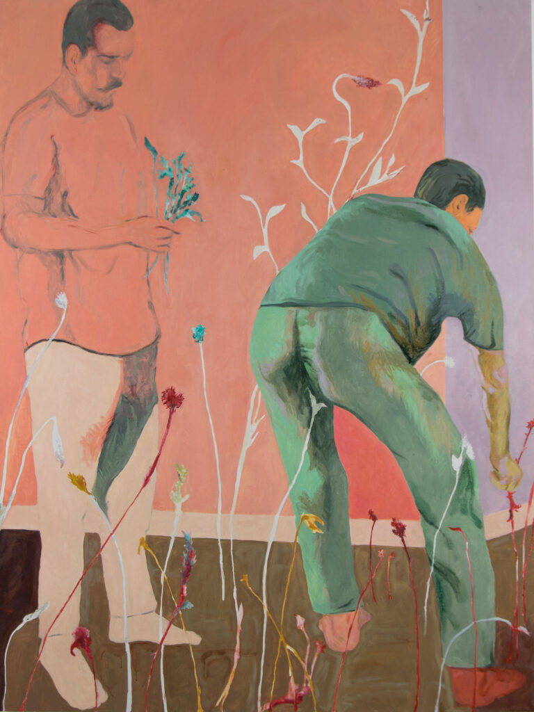 In particolare, nei suoi lavori più recenti, Gallace affida tale poetica all’elemento floreale, che per mezzo di forme fragili, sempre sul punto di piegarsi o rompersi, si insinuano in contesti umani, domestici e familiari. Oltre a incidere la superficie pittorica rilevandone la stratificazione, le piante incrinano l’incanto fiabesco in cui Gallace allestisce le sue opere, evocando il dualismo tra l’illusione tipica dell’infanzia e la disillusione della giovinezza.