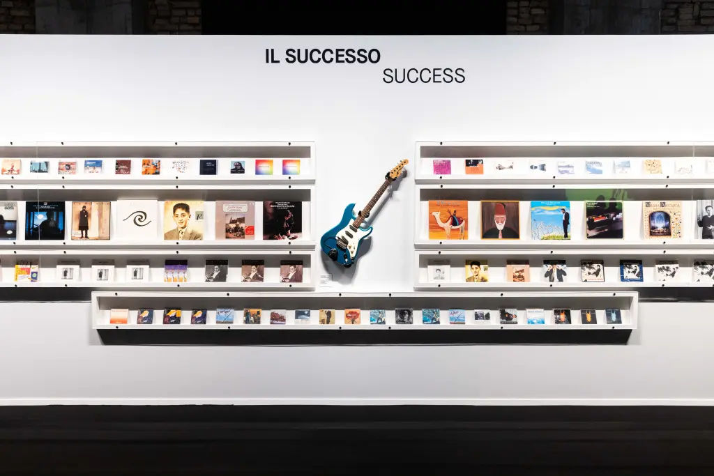 Cuore simbolico e percettivo della mostra è lo spazio ottagonale, eco dell’ottava musicale, in cui un sistema Dolby Atmos e cinque videoclip avvolgono il visitatore in un’esperienza sinestetica, più contemplativa che spettacolare. Attorno, copertine, fotografie, manifesti e cimeli non funzionano come reliquie, ma come indizi di un percorso in continua trasformazione.