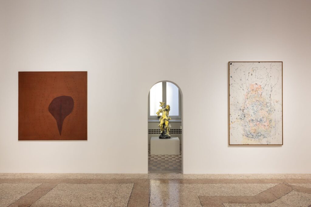 In mostra anche uno straordinario esempio della serie Fine di Dio di Lucio Fontana, ampiamente considerata come l’apice della sua pratica. L’artista ha realizzato solo 38 Fine di Dio in un breve periodo che va dal 1963 al 1964. La sua forma ovale rappresenta allo stesso tempo l’origine e l’assoluto; come dichiarava l’artista stesso essa rappresenta «l’infinito, l’inconcepibile, la fine della figurazione, l’inizio del nulla». Esposta nella sala principale della galleria Thaddaeus Ropac di Milano, la Fine di Dio con il suo rosa intenso entra in dialogo con La rosa riposa di Baselitz del 2019, le cui figure nude si srotolano attraverso una tavolozza cromatica altrettanto sensuale.