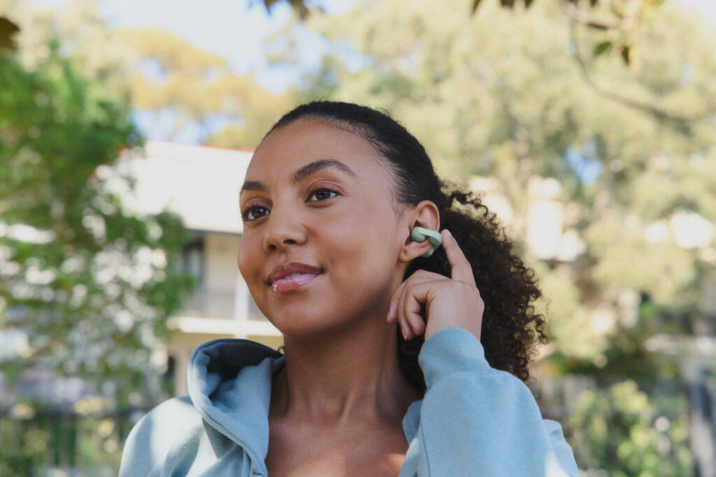 Il design open-ear a clip non invade il condotto uditivo, lo aggira. La forma a C, ispirata agli ear cuff, si appoggia all’orecchio con una presenza leggera e dichiaratamente visibile, quasi ornamentale. È un design che non chiede di scomparire, ma di essere abitato: il corpo resta permeabile, attraversato dall’aria, dalle voci, dal traffico urbano. L’ascolto diventa una pratica continua, non un’interruzione.