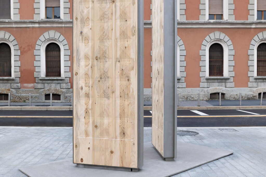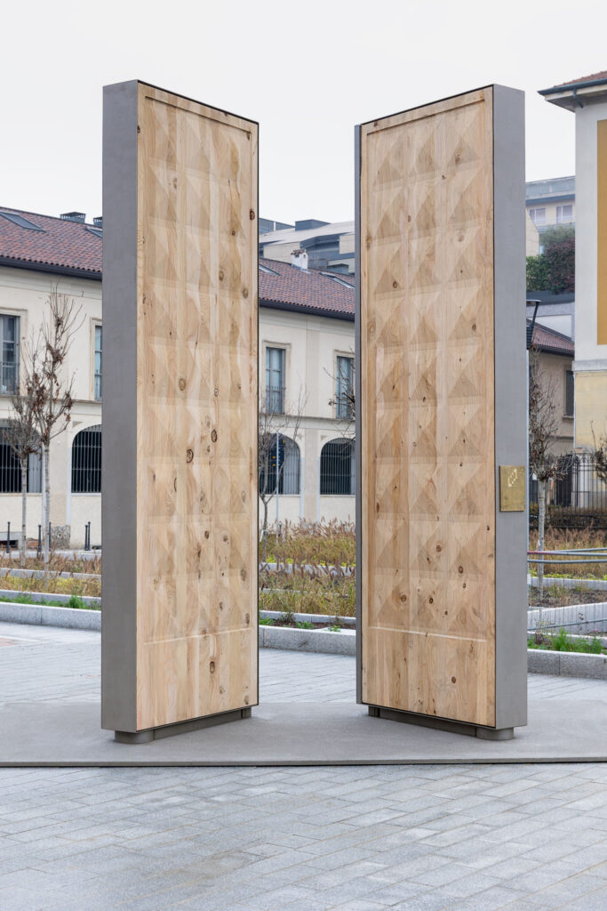 L’opera si compone di due alti battenti semichiusi, privi di telaio, che evocano un varco aperto all’ignoto. La superficie, definita da un bugnato sfaccettato ispirato a quello rinascimentale — in particolare a Palazzo dei Diamanti di Ferrara, città natale dell’architetto — suggerisce una forza non come barriera, ma come fondamento del passaggio. La Porta non distingue un dentro e un fuori: è un’architettura senza muro, un invito a considerare la trasformazione come un cammino condiviso e non come un gesto isolato.