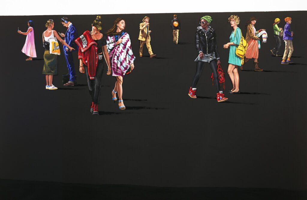 Il colore come sappiamo ha implicazioni emotive e simboliche ed insieme alle struttura del dipinto contribuisce a determinare l’equilibrio e il dinamismo dell’opera. Inoltre per me è la parte più sensuale e divertente del lavoro, la consistenza, l’odore, cercare un complementare per un’ombra, mescolare i colori e poi stenderli ha qualcosa di trascendente, quello che negli ultimi anni si ama definire come « Flow ». Come raccontavo in precedenza gli sfondi ho iniziato molti anni fa a cancellarli e renderli di un bianco coprente e uniforme e mi ha consentito di centrare l’attenzione solo sui soggetti umani; in seguito, durante un viaggio in Islanda subito dopo il lockdown mi è capitato di camminare sui versanti di un vulcano attivo nerissimo e di assistere al movimento di tutte queste figure che come me arrancavano, come uscissero dal buio e l’ho trovato davvero molto potente e allegorico.