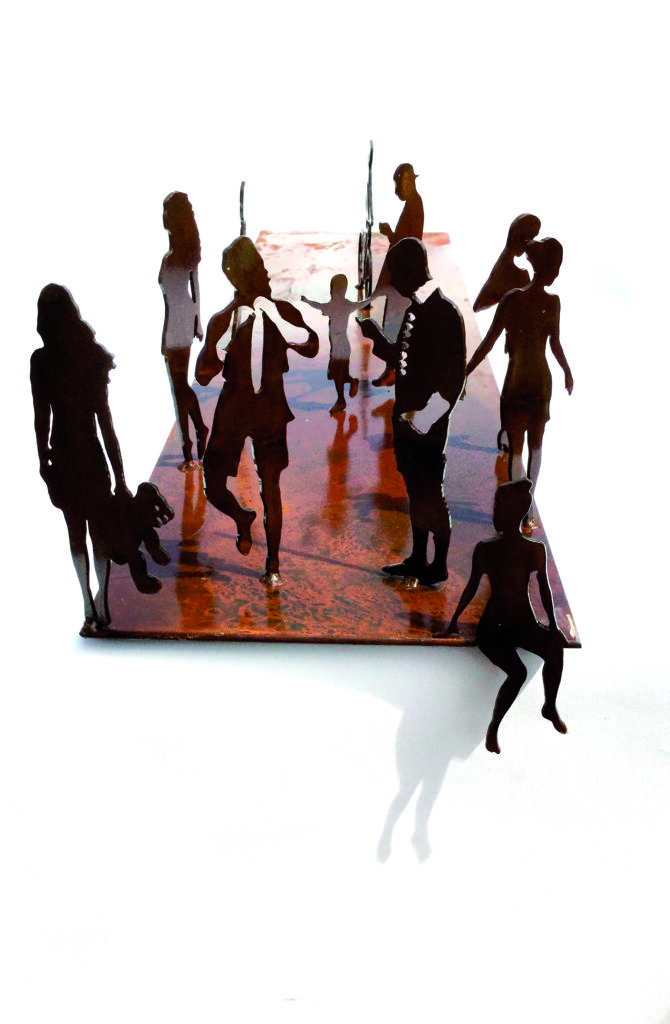 L’approccio è lo stesso della pittura, naturalmente ancora più essenziale, creo delle silhouettes in ferro che a volte lascio arrugginire a volte dipingo con colori piatti. Curiosamente ho cercato una soluzione che mi consente di mantenere le figure quasi bidimensionali come sulla tela ma contemporaneamente posso occupare spazi molto grandi, creando praticamente dei palcoscenici su cui ci si può spostare in modo da vedere l’opera da tutte le angolazioni e non solo frontalmente