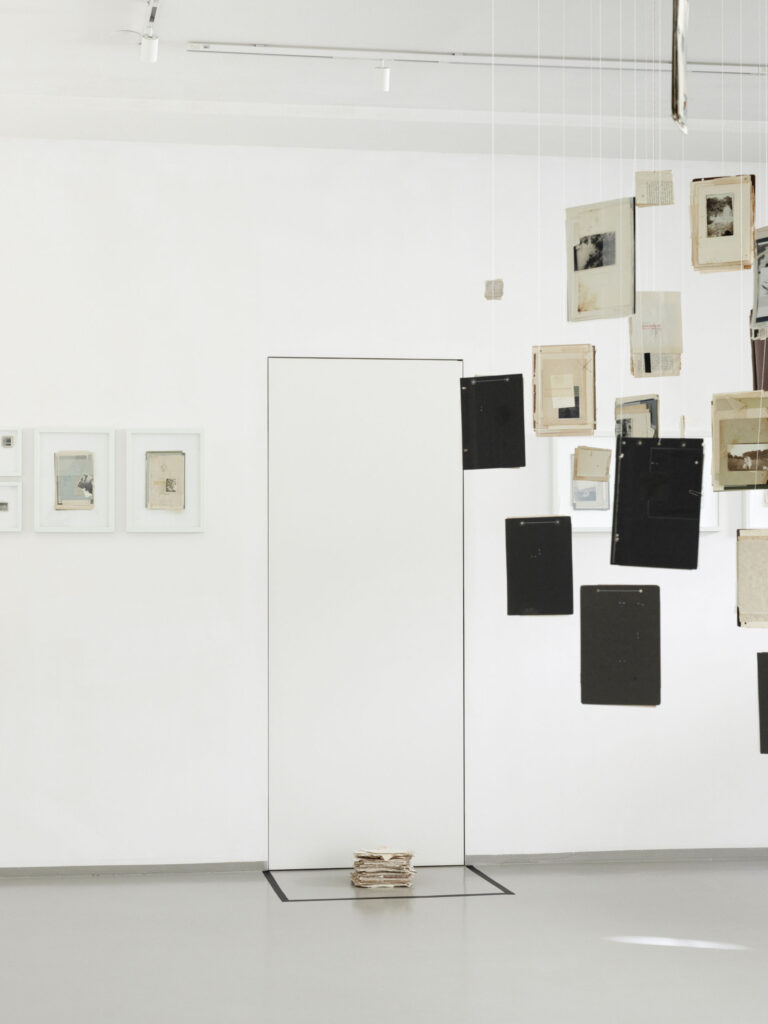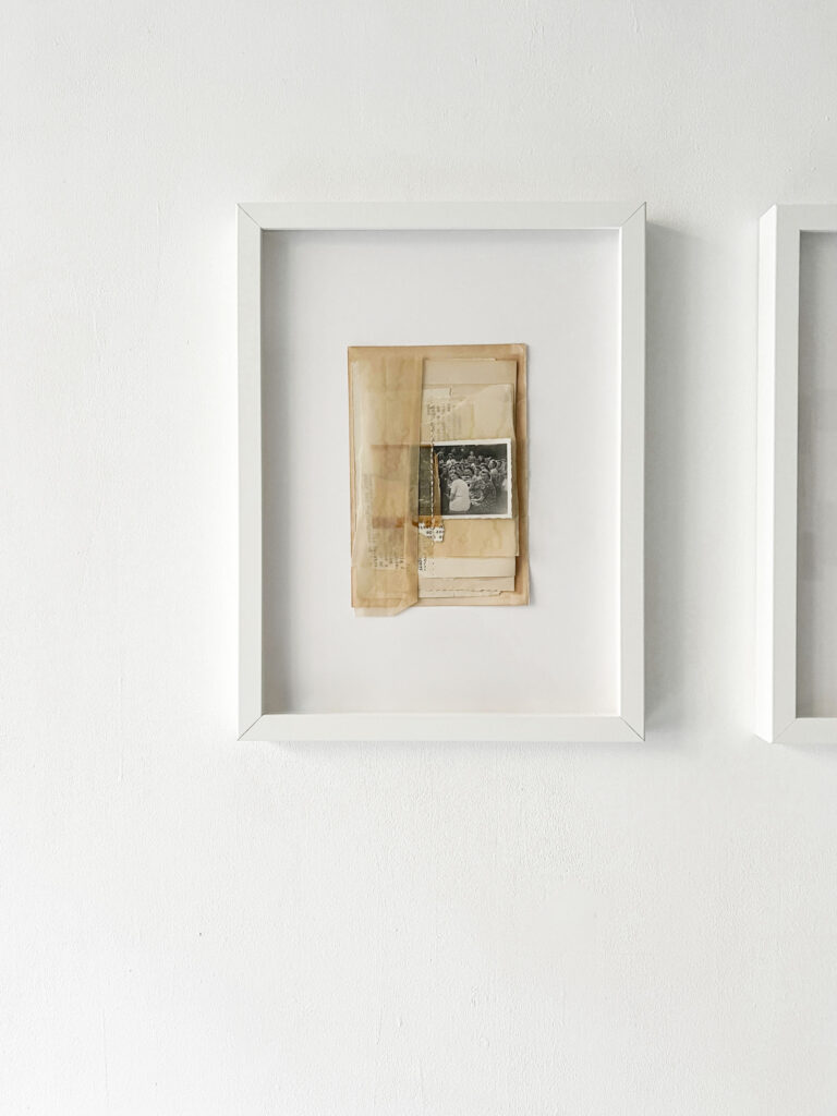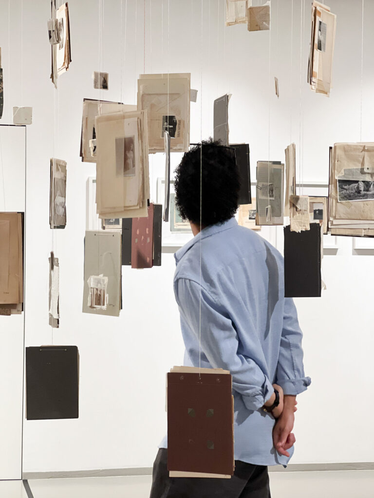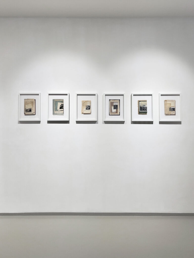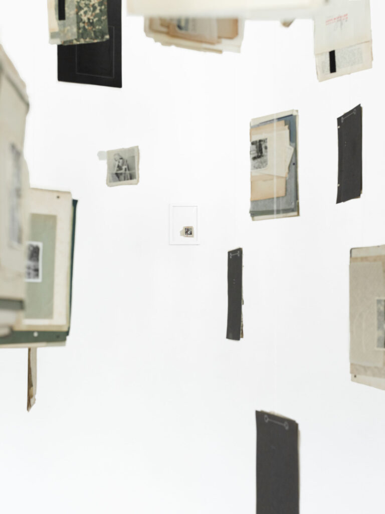 La terza sezione, denominata “Collage Sospesi”, si manifesta come un intenso e suggestivo esercizio di immersività: collage realizzati e sospesi nello spazio tramite sottili fili trasparenti che si adagiano nell’ambiente, creando un’atmosfera di leggerezza e fluida precarietà. Questi assemblaggi visivi sembrano fluttuare in modo spontaneo e imprevedibile, invitando lo spettatore a attraversare e interagire con strati sovrapposti di memorie e immagini, che si sovrappongono come tracce di un passato onirico.