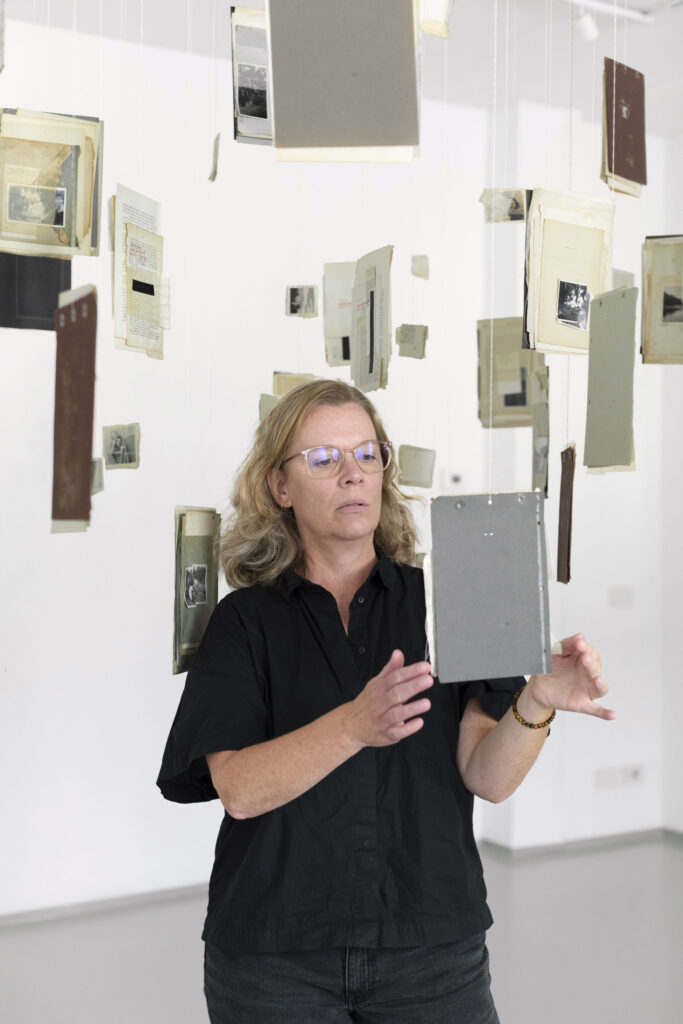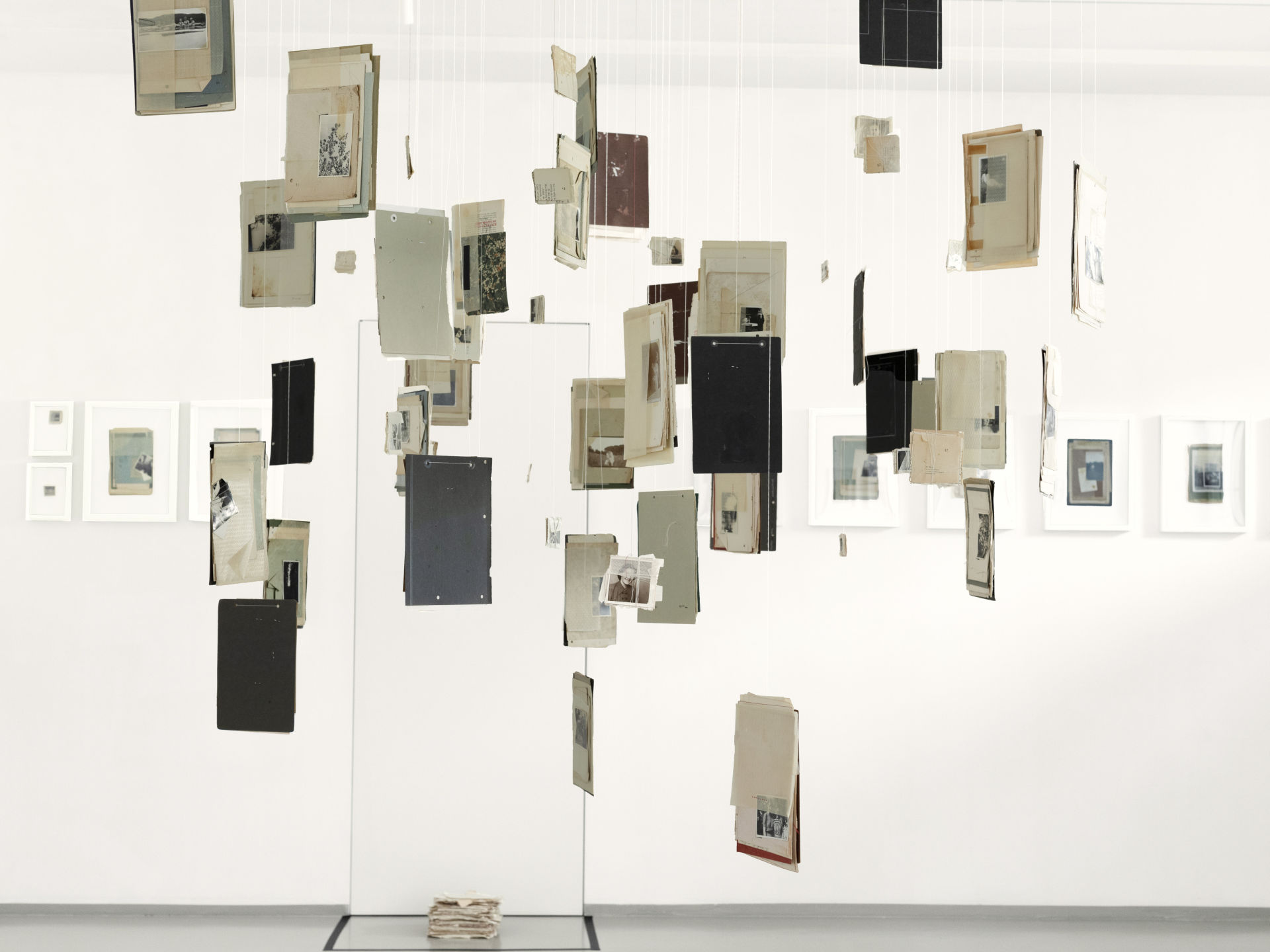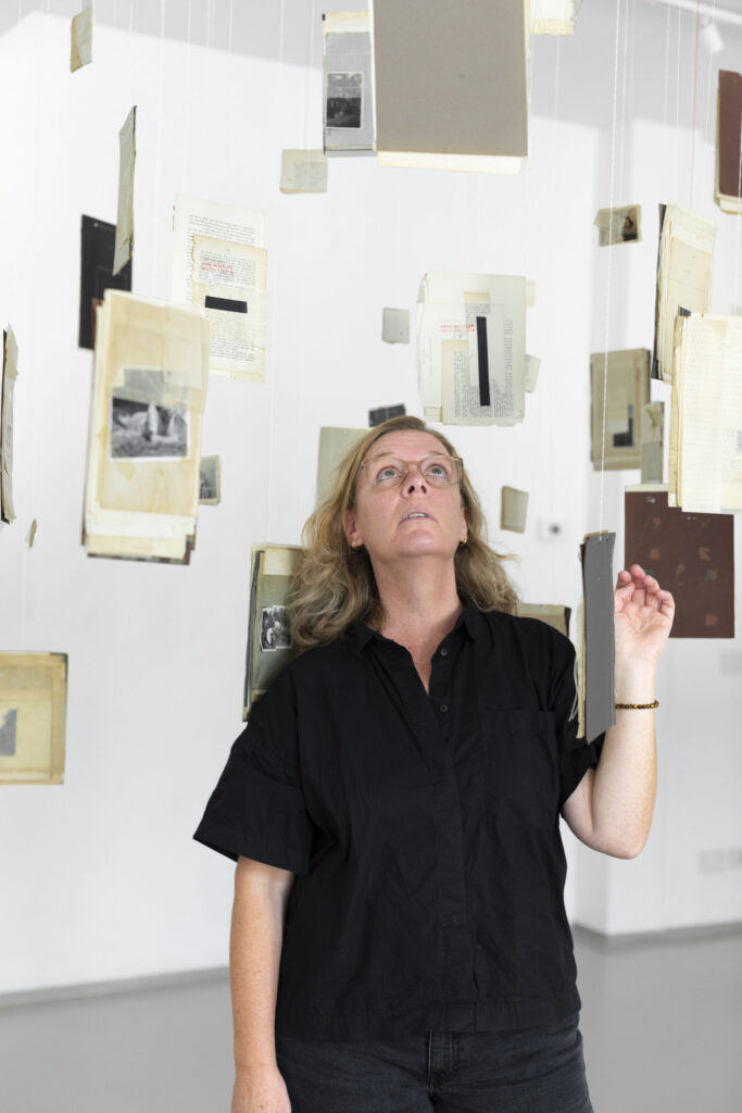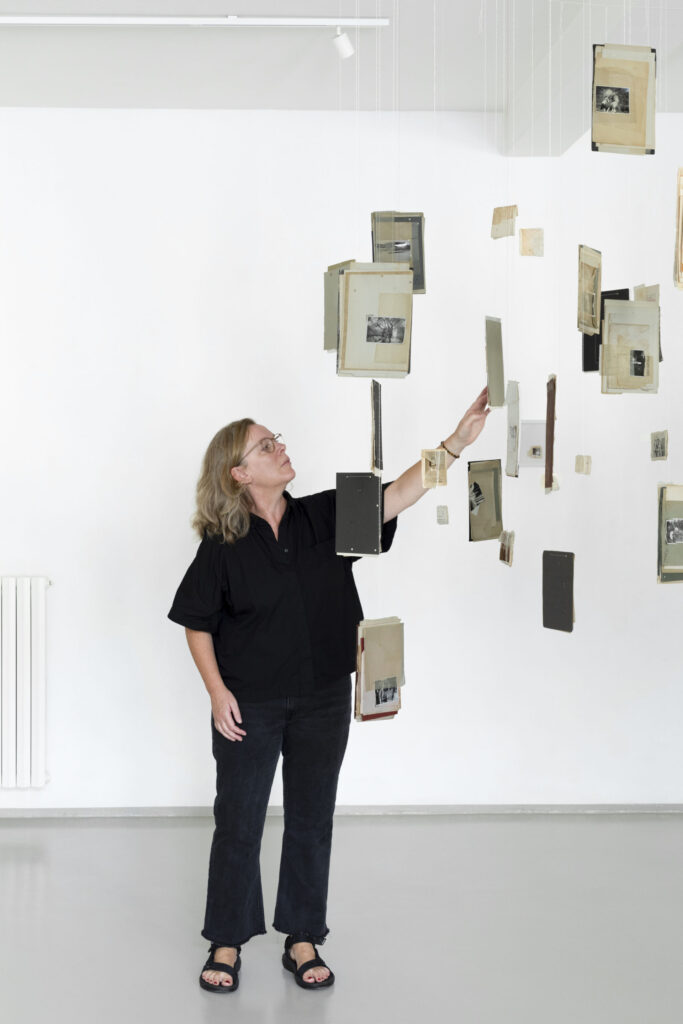 La terza sezione, denominata “Collage Sospesi”, si manifesta come un intenso e suggestivo esercizio di immersività: collage realizzati e sospesi nello spazio tramite sottili fili trasparenti che si adagiano nell’ambiente, creando un’atmosfera di leggerezza e fluida precarietà. Questi assemblaggi visivi sembrano fluttuare in modo spontaneo e imprevedibile, invitando lo spettatore a attraversare e interagire con strati sovrapposti di memorie e immagini, che si sovrappongono come tracce di un passato onirico.