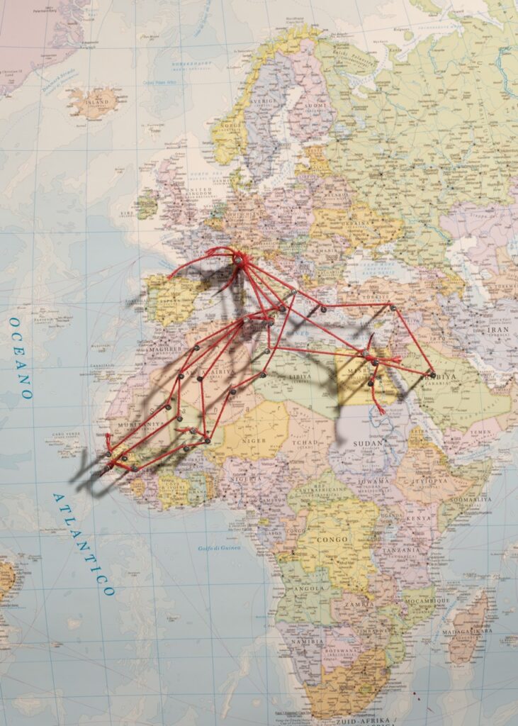 Arrivati al termine di questo percorso, incontriamo Al-riḥla (Il viaggio): un progetto realizzato con il videomaker Nico Cremonesi (editing e sound design di Massimo Leonardi) e i ragazzi della Comunità San Francesco di Chiaravalle, in cui la geografia diventa il luogo dove la memoria si intreccia al corpo e alla scelta. Su una cartina, apparentemente neutra e oggettiva, giovani migranti tracciano il proprio percorso con fili rossi e chiodi, costruendo una geografia alternativa fatta di ricordi, decisioni, tagli e legami. Ogni filo racconta una traiettoria unica: si tende, si annoda, si spezza. È strada, ma anche ferita. Il rosso è il colore spesso associato alla migrazione, ma è anche il colore del sangue, dell’amore, del coraggio di resistere. I chiodi sono insieme àncore e cicatrici, testimonianza del peso di ogni passaggio. Al-riḥla è un’opera sulla soggettività di chi è spesso ridotto a categoria, un invito a guardare oltre i confini disegnati sulle mappe, a dare ascolto alle voci che si muovono sotto la superficie visibile del mondo. Un esercizio di memoria attiva, dove il gesto del tracciare diventa un modo per riappropriarsi della propria storia, come un campo da gioco aperto, un universo di possibilità.