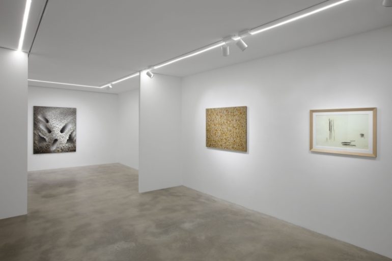Lee Bae (1956) lavora invece con silenti composizioni che declinano elegantemente tutte le possibilità cromatiche del nero, ottenuto attraverso sottilissimi strati di carboncino o di lamelle di legno combusto. La combustione e l’effetto del fuoco alludono qui alla metamorfosi di tutte le cose e alla considerazione, comune a tutti gli artisti in mostra, dello spazio pittorico come un evento soggetto all’azione del tempo e quindi aperto anche alla quarta dimensione.