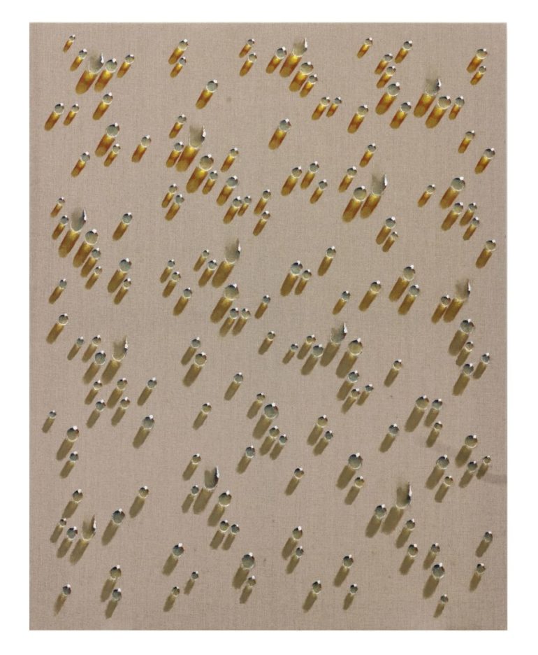 Chun Kwang Young (1944) fa collidere pittura e scultura in superfici animate da miriadi di pacchettini di carta Mulberry tinta col tè o altri pigmenti naturali, un ricordo d’infanzia legato all’uso coreano di impacchettare con la carta di giornale erbe medicinali e spezie. Come recita il titolo di questi quadri, essi sono “aggregazioni” di armonia e conflitto, di natura e cultura, di ordine e caos.