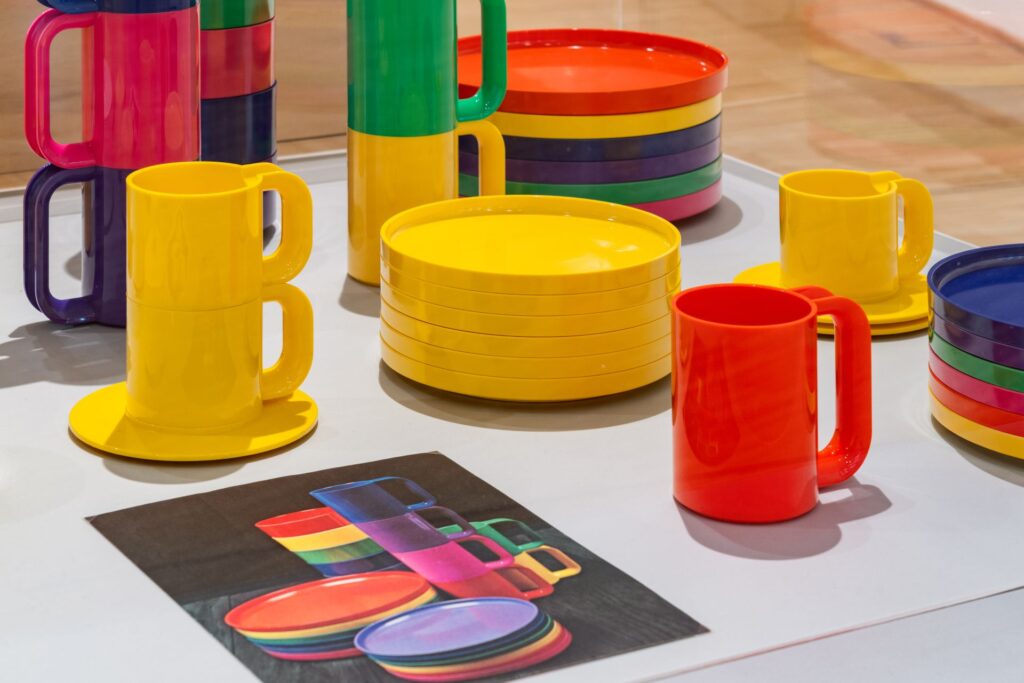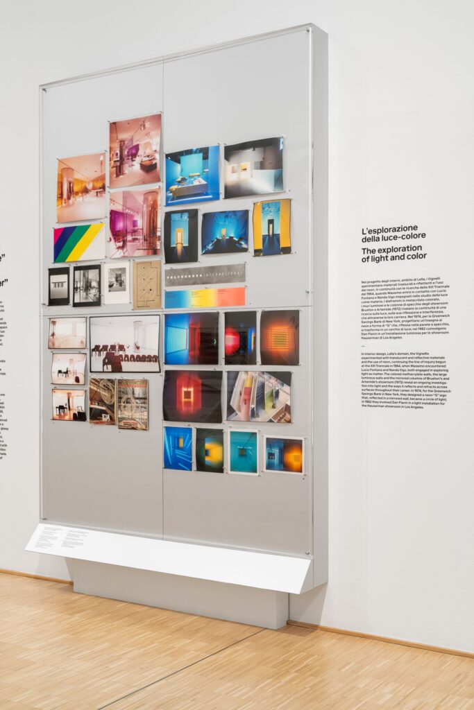 La mostra ripercorre anche alcune storie progettuali strettamente legate alla vita del nostro Paese, grazie a un racconto che si sviluppa su fronti tematici e disciplinari molto diversi tra loro: dall’editoria, con progetti per Feltrinelli, al design della comunicazione visiva applicata ai trasporti, con il progetto per le Ferrovie dello Stato, quello della moda, con i lavori per Benetton e Fratelli Rossetti, quello della cultura del vino e dell’enologia, per Feudi di San Gregorio, oltre al broadcasting televisivo con il progetto per il Tg2, telegiornale della seconda rete Rai. Sono esposti oggetti, arredi, disegni, modelli, bozzetti, fotografie, packaging, gioielli, marchi, libri, copertine e riviste, che ricostruiscono la storia dei due progettisti immersi nell’humus di comunità creative internazionali tra Italia e Stati Uniti: da un lato Milano, nel pieno del fermento della rinascita culturale del dopoguerra, e dall’altro lato New York, metropoli cosmopolita al centro di possibilità illimitate, dove la coppia scelse di stabilirsi a partire dal 1965.