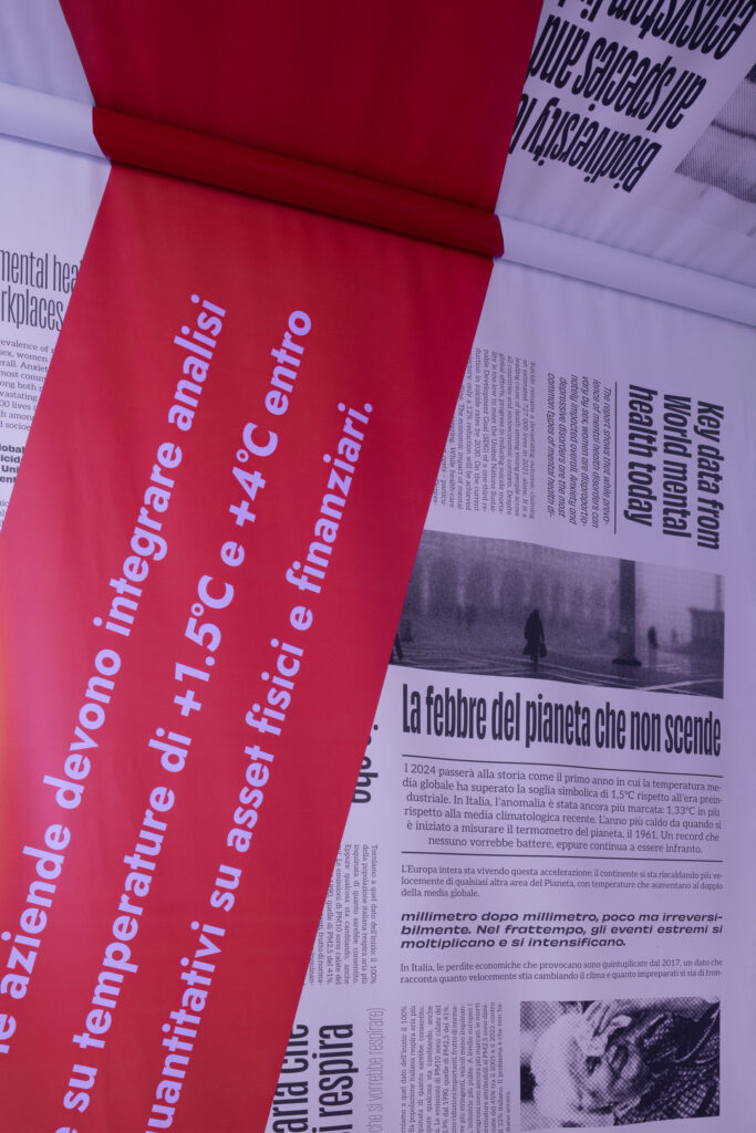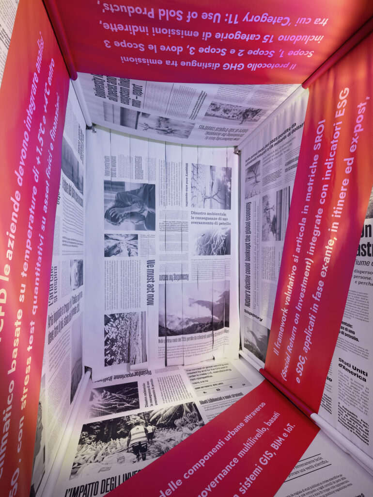 È seguita La selva dei codici, una foresta simbolica formata da fasce sospese che riportavano sigle, trattati, acronimi e normative globali. Il visitatore attraversava un groviglio di linguaggi che restituiva l’estenuante complessità del discorso sulla sostenibilità, troppo spesso ridotto a slogan. I pannelli esplicativi hanno funzionato da appigli, ma è stata la sensazione di spaesamento a raccontare meglio di qualunque definizione lo stato delle cose.