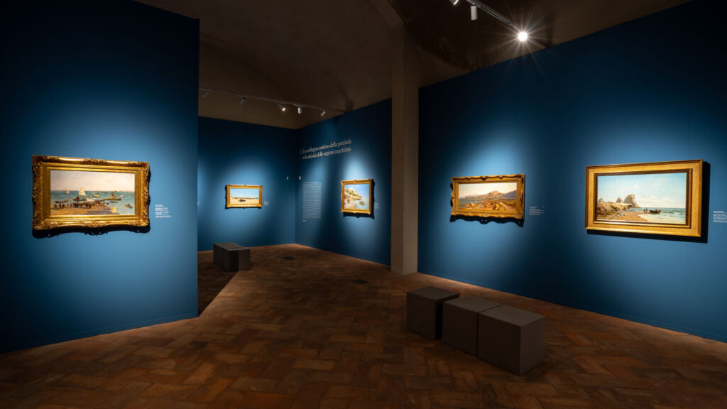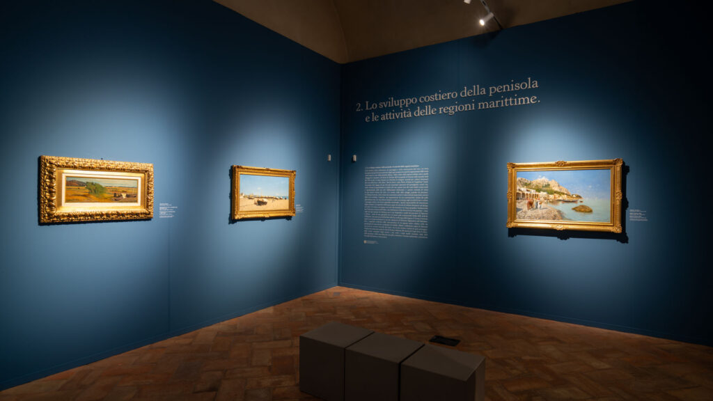 La seconda sezione illustra la varietà delle nostre coste, in prevalenza alte, frastagliate, rocciose e scoscese quelle che si affacciano sul Mar Ligure e sul Mar Tirreno, per lo più basse con spiagge sabbiose e ghiaiose quelle che si affacciano sul Mar Adriatico. Oltre 8000 chilometri di territori molto diversi per morfologia, struttura geologica, varietà di ambienti naturali, insediamenti umani e produttivi. L’articolato territorio costiero e le attività dei suoi abitanti saranno documentati da dipinti di Giovanni Fattori (1825-1908), Vincenzo Cabianca (1827-1902), Luigi Steffani (1828-1898), Francesco Lojacono (1838-1915), Rubens Santoro (1859-1941) e molti altri.
