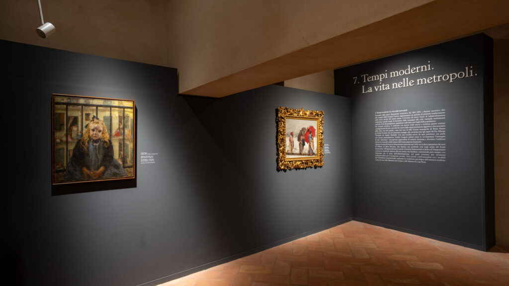 L’ultima sezione della mostra è dedicata ai diversi aspetti della vita quotidiana dei nuovi Italiani nelle più moderne città del Paese. Città industrializzate e sempre più popolose nelle quali lusso e miseria convivevano spesso l’uno accanto all’altra. Città che alternavano zone lussuose con splendidi complessi edilizi contemporanei perfettamente rispondenti alle rinnovate esigenze della facoltosa borghesia, a zone squallide e fatiscenti abitate da una popolazione spesso priva di un lavoro regolare, costretta per poter sopravvivere ai lavori più umili o all’accattonaggio. Straordinari episodi di vita moderna documentati da grandi artisti tra i quali Emilio Longoni (1859-1932), Giovanni Sottocornola (1855-1917), Angelo Morbelli (1853-1919), Attilio Pusterla (1862-1941), Francesco Netti (1832-1894), Demetrio Cosola (1851-1895) e Italo Nunes Vais (1860-1932).