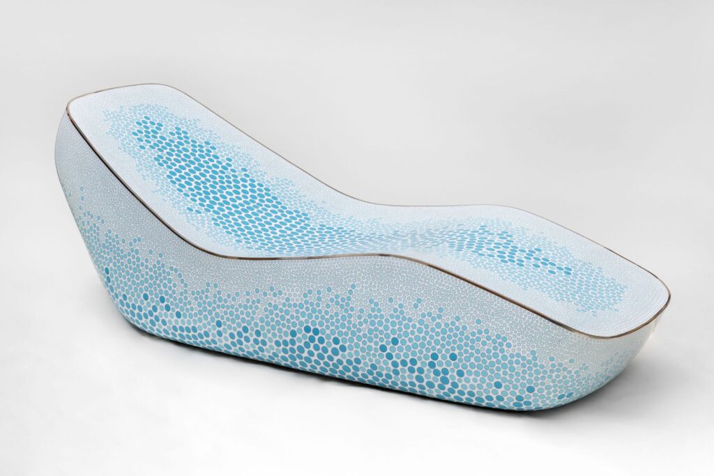 La complessità produttiva dei lavori esposti rivela una dimensione spesso invisibile del design contemporaneo. Diverse sedute e chaise longue presentano decorazioni realizzate in smalto cloisonné, tecnica antichissima che Newson ha portato a una scala quasi paradossale. Per farlo ha creato un laboratorio dedicato in Cina, riattivando una tradizione che raramente viene applicata a oggetti di tali dimensioni.