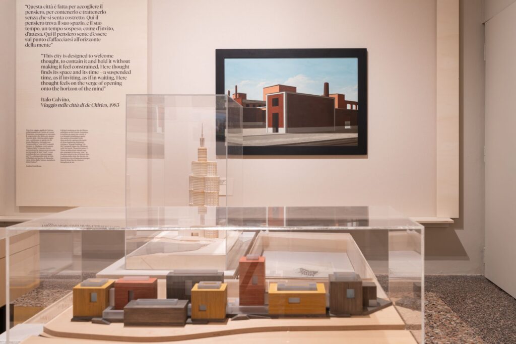 La mostra documenta inattese riprese e riattivazioni. Piazze e statue, archi e portici, torri e ombre, manichini e nature morte assumono il valore di lettere di un alfabeto visivo che viene riletto su registri diversi in momenti significativi della fotografia, dell’architettura, del design, della moda, del teatro, del cinema, del graphic novel e della musica tra XX e XXI secolo. Tra tributi e reinvenzioni.