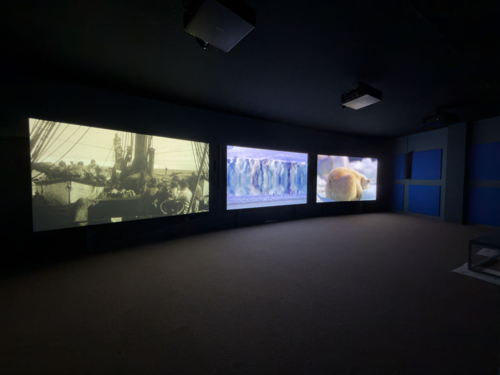 Nella stessa sala una parete ospita un grande pannello del Collettivo A Constructed World che riproduce l’interno di un ventre di balena cui si potrà accedere attraverso una scala blu. Mentre uno scatto di Francesco Jodice a un diorama del Museo di Storia Naturale di New York, che ritrae il combattimento tra un calamaro gigante e un capodoglio da sempre percepite come creature mostruose, coglie la presenza di una bottiglia di plastica abbandonata da un visitatore del museo, destinata a resistere al tempo.