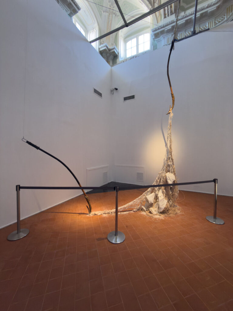 Il racconto del mito della balena attraverso l’arte contemporanea prosegue con Mauro Panichella, che trafigge un osso del cranio del cetaceo con un neon a evocare allo stesso tempo la luce di un baleno e l’arpione; Teresa Solar, con un’opera in prestito dalla collezione Thyssen-Bornemisza Art Contemporary, composta da due grandi chele che evocano forme marine e meccaniche insieme.
