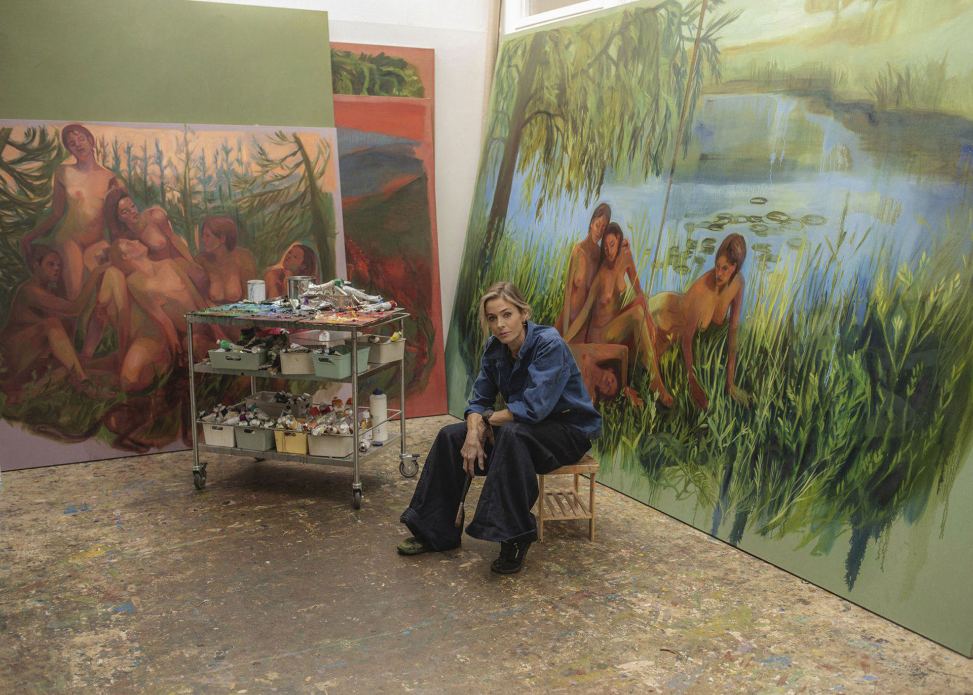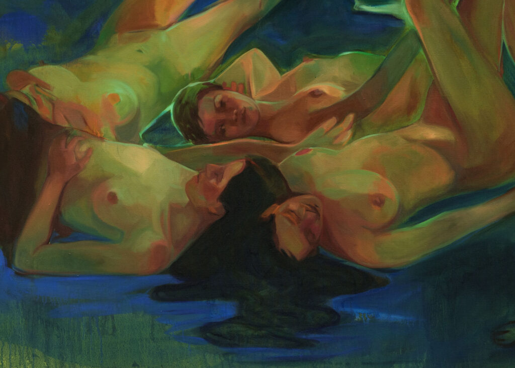 Le grandi tele di Raw abitano territori immaginari che oscillano tra il sogno e l’archetipo, tra l’intimità emotiva e una dimensione quasi liturgica della natura. Le figure femminili, spesso colte in uno stato di sospensione contemplativa, non si offrono allo sguardo come icone passive, ma come soggetti in trasformazione. Qui la pittura non descrive: convoca. Non illustra: invoca.