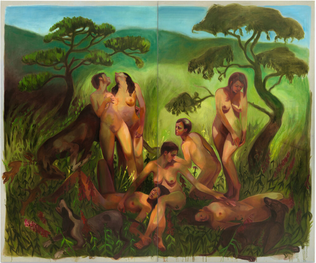Opere come And So It Is (2025), con la figura femminile che stringe un cardellino, evocano una genealogia iconografica che rimanda a Eva, ma senza colpa né caduta. Il gesto contiene simultaneamente gioia e conoscenza, tentazione e ritorno spirituale, come se la pittura cercasse una riconciliazione tra origine e futuro. In The Dark Days Are Over (2025), invece, il paesaggio si fa Eden interiore, instabile, attraversato da una tensione tra rovina e rigenerazione: un territorio emotivo dove memoria e sacro si intrecciano senza gerarchie.