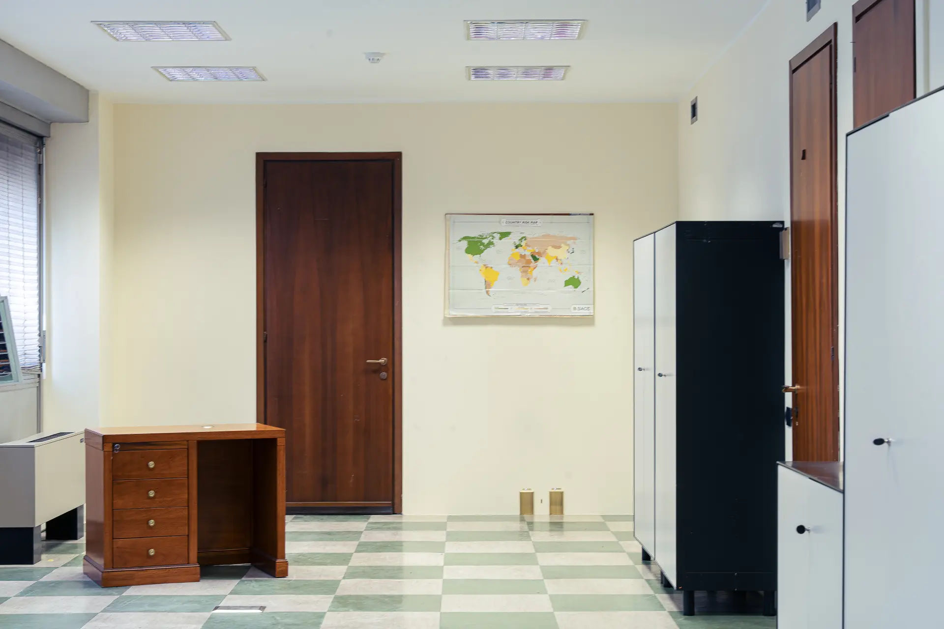 Marta Ravasi opera una trasfigurazione delicata di un arredo dell’ex ufficio, trasformandolo in un dispositivo pittorico che mescola la domesticità del mobilio con l’eccesso simbolico della superficie dipinta, condizione che rende familiare e straniante l’oggetto quotidiano. Gli interventi site-specific di Flavio Favelli e Vedovamazzei restituiscono vitalità a cavità dimenticate dell’edificio attraverso gesti ironici e spiazzanti: il loro approccio, insieme critico e ludico, smaschera le modalità di conservazione e abbandono, proponendo soluzioni estetiche che sono al contempo commento sociale.
