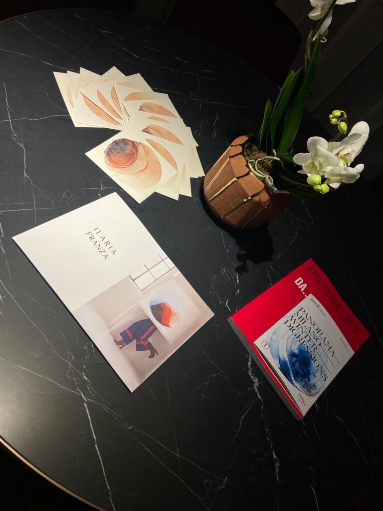 L’hotel diventa una soglia. Fuori, la città vibra nell’attesa; dentro, le opere costruiscono un lessico visivo che intreccia pittura, fotografia, scultura leggera e interventi materici. Le superfici dipinte sembrano trattenere una temperatura interiore, stratificazioni che evocano neve compressa e silenzi d’altitudine. I materiali, ruvidi e porosi, rimandano a una geologia emotiva più che a una topografia reale. Le immagini fotografiche aprono fenditure su scenari sospesi, dove moda e ambiente si incontrano in una ritualità controllata, quasi liturgica.