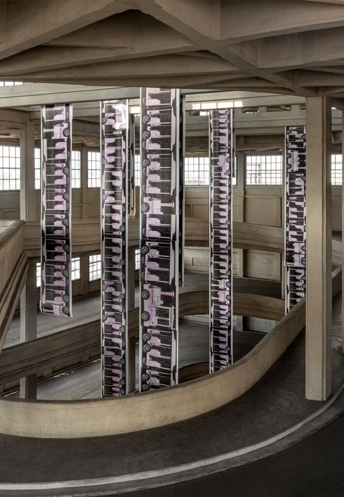 L’opera di Peter Fischli, ADDITION, SUBTRACTION, MULTIPLICATION (2026) attraversa verticalmente lo spazio della rampa ellittica dell’ex fabbrica FIAT del Lingotto. L’opera prende avvio dall’immagine dei trenini turistici su ruote – i cosiddetti “treni senza binari” – che attraversano le città offrendo un’esperienza di visita guidata standardizzata e predeterminata.