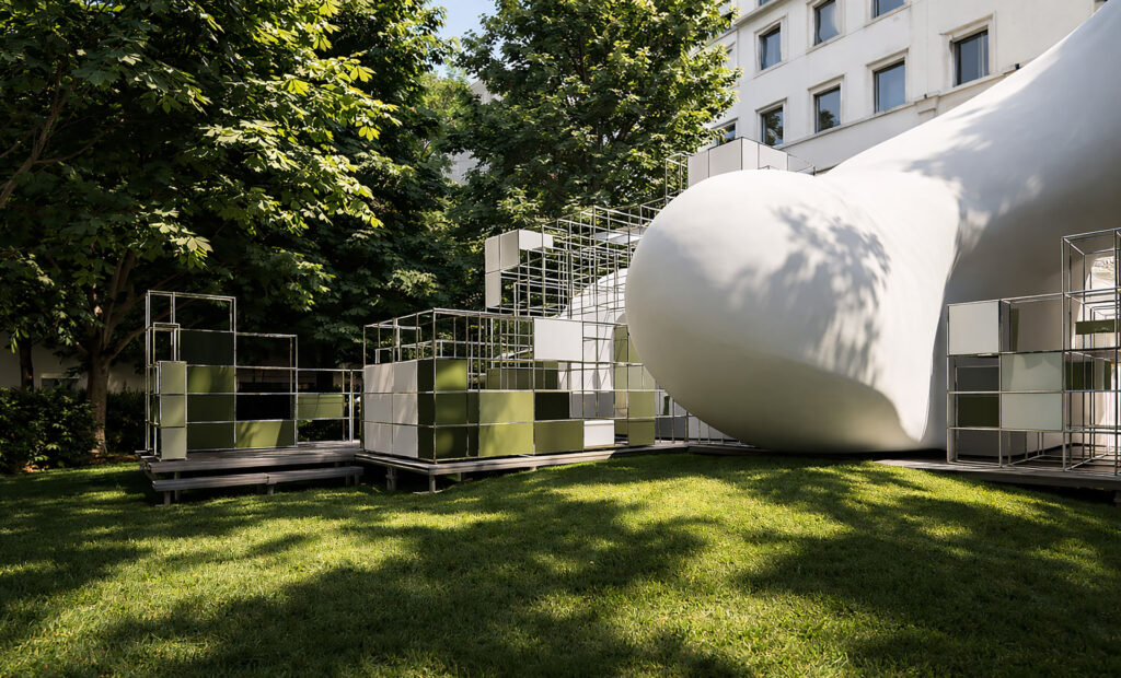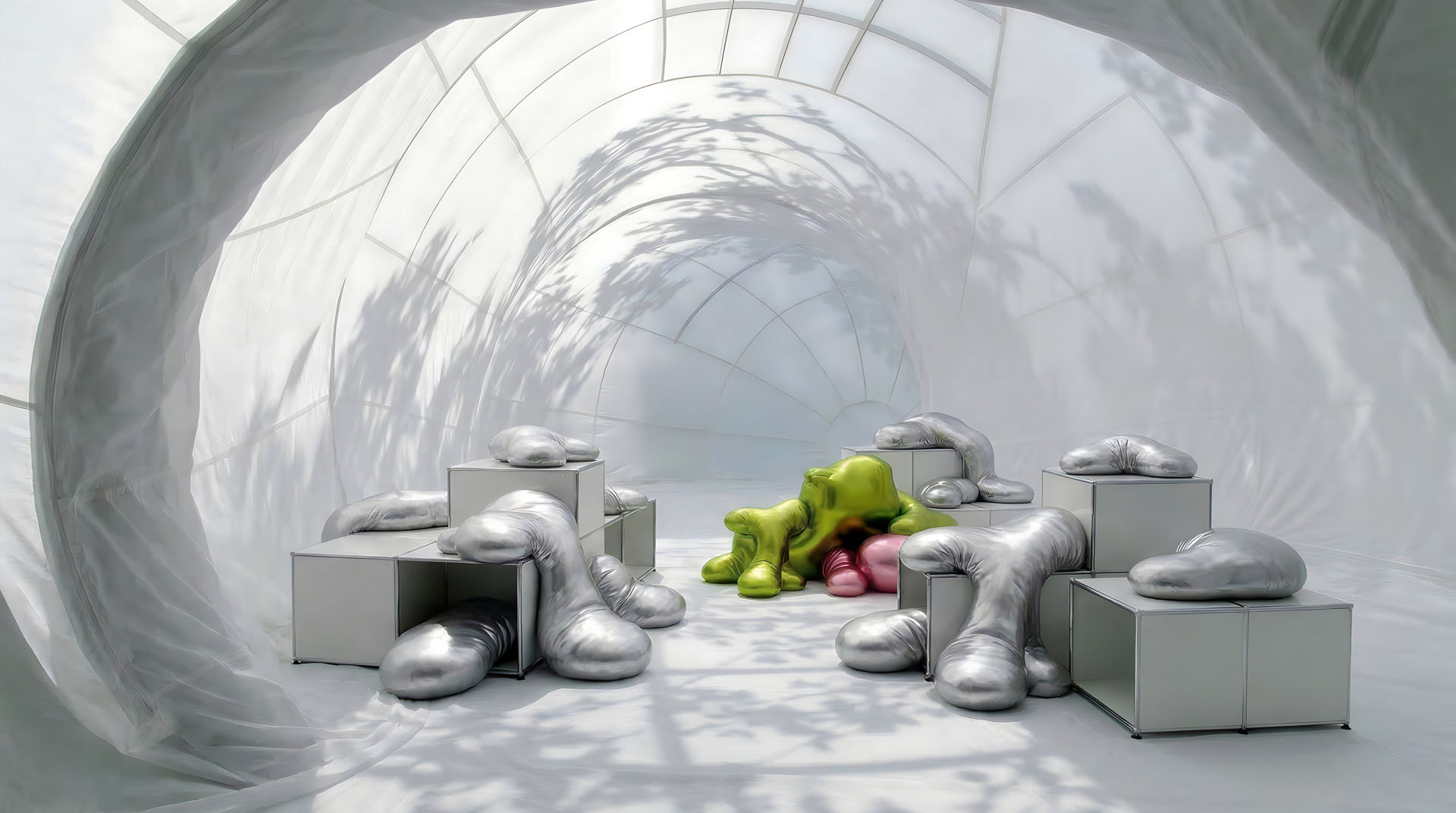Il cuore dell’installazione è costituito dall’iconico sistema modulare USM Haller. Da oltre 60 anni, USM ha definito un linguaggio progettuale basato su precisione e adattabilità. In questo caso, il sistema trascende il suo ruolo di arredo, fungendo da scheletro architettonico che sostiene una morbida membrana tessile che si espande e si contrae impercettibilmente, come un organismo che respira. Questa bolla, simile a un bozzolo, crea un dialogo tra la griglia modulare in acciaio e la morbidezza fluida e organica, uno spazio in cui coesistono struttura e vulnerabilità.