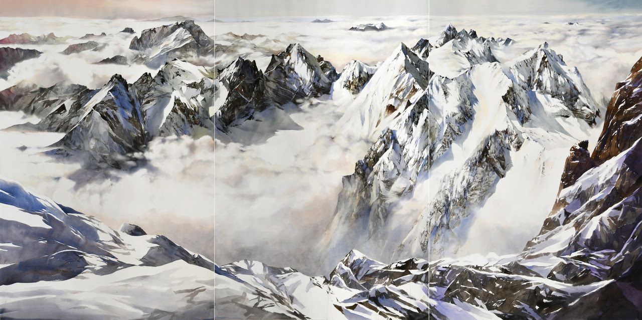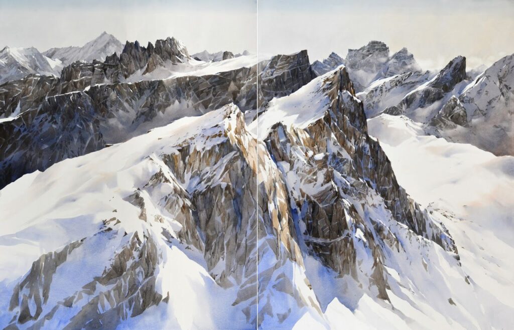 Esposti 30 acquerelli, anche di grandissime dimensioni, 2,3 x 4,5 metri, dedicati ai luoghi delle Olimpiadi invernali. La pittura come linguaggio vivo per raccontare le montagne di Milano Cortina. Compaiono inoltre alcuni album preziosi dedicati agli studi e alla didattica, nonché fotografie dell’artista al lavoro. Il progetto espositivo e l’allestimento, firmati dall’architetto Michele Piva, puliti ed essenziali, sono di grande fascino e impatto e sottolineano il virtuosismo dell’artista. Il percorso è amplificato dalla presenza di una video-installazione prodotto da Alps che accompagna il pubblico alla scoperta dello sguardo peculiare dell’artista.