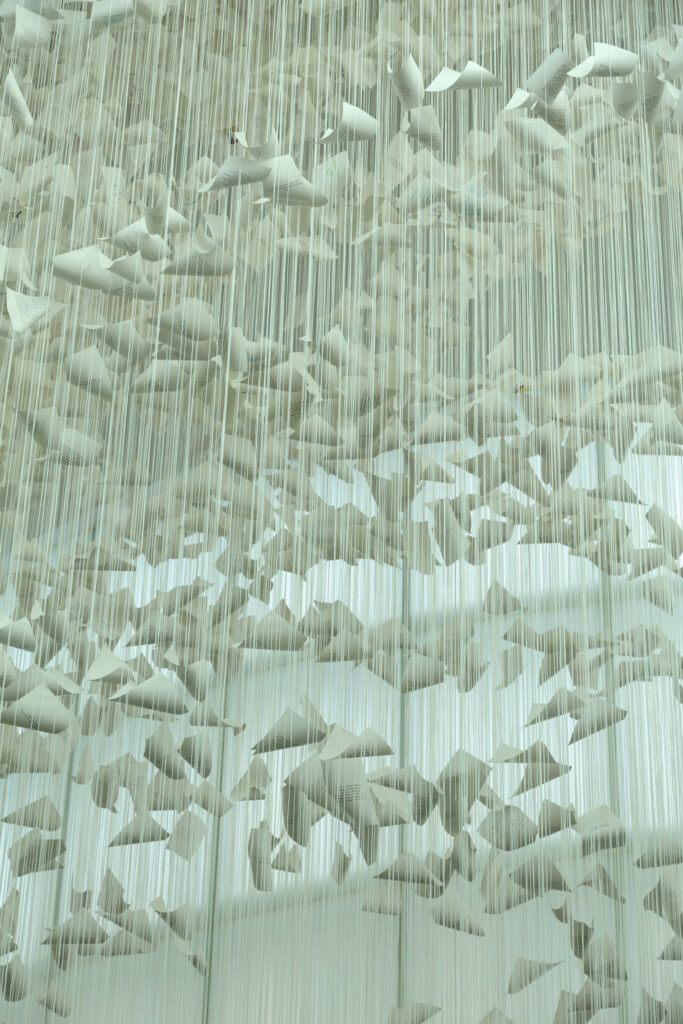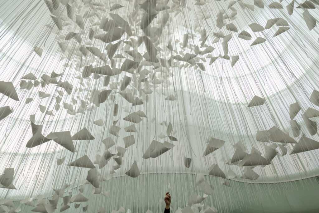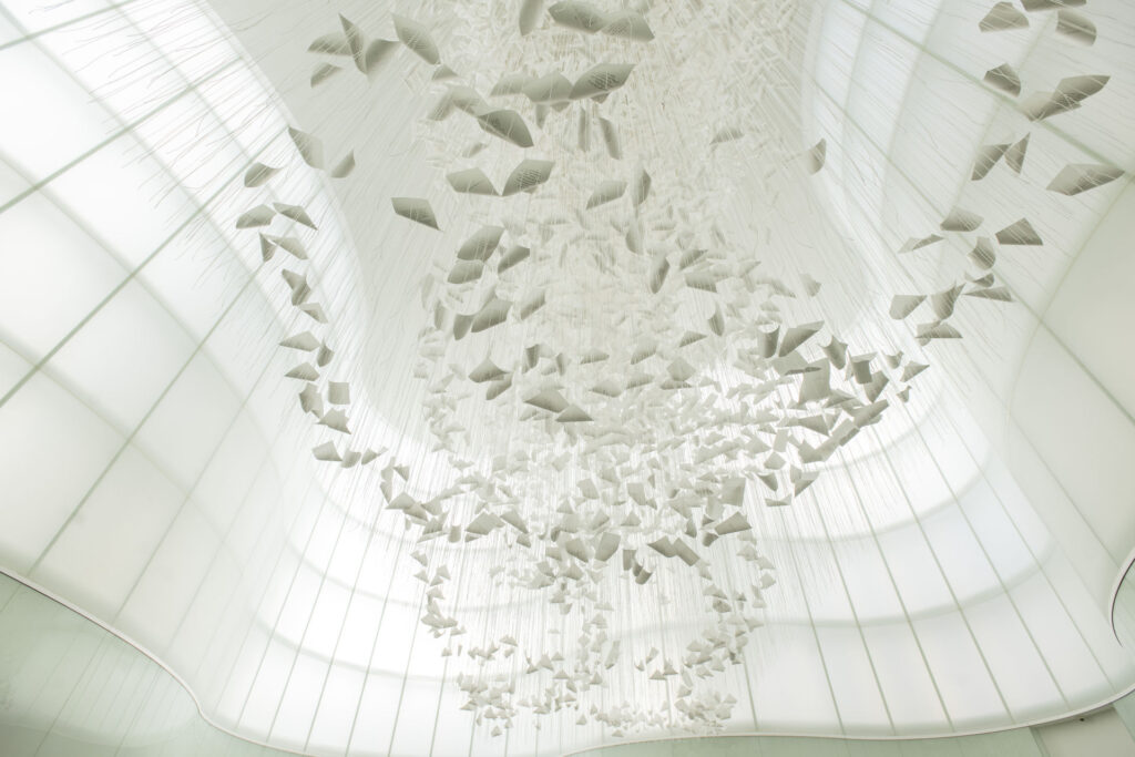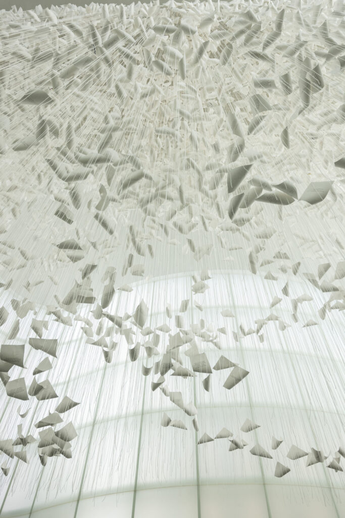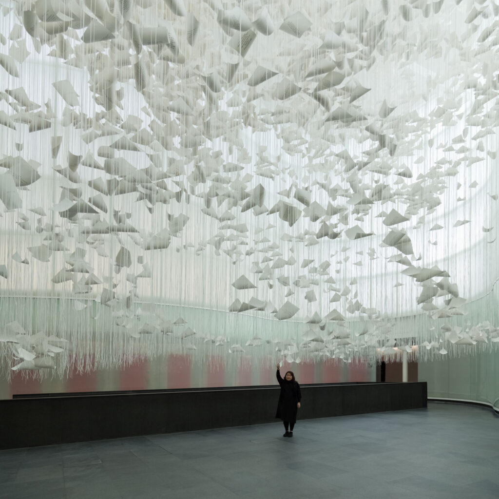 Shiota, fedele al suo lessico fatto di assenze tangibili, costruisce una topografia emotiva che riflette sulla porosità delle relazioni: fili che connettono e insieme separano, carte che fluttuano come reliquie di un incontro perduto, un bianco immaginato che non cade mai davvero. Entrando nell’installazione, si attraversa una soglia sospesa dove l’individuo diventa parte del tessuto collettivo, un punto nell’ordito di una mappa affettiva più grande.