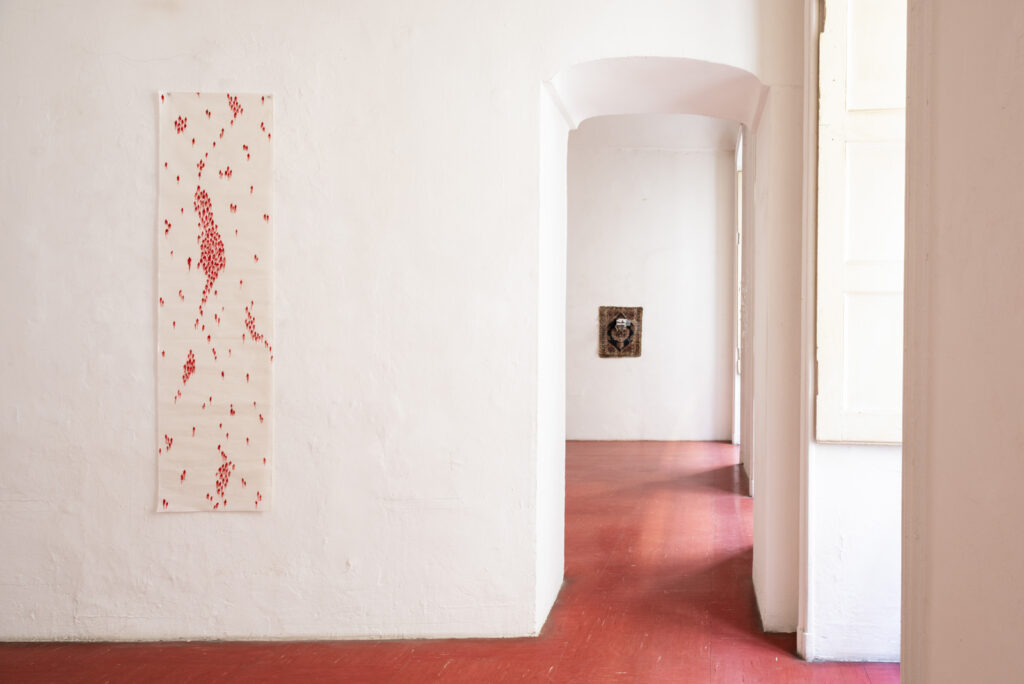The Sky is Bleeding, richiama il detto persiano secondo cui l’acqua è una porta sul cielo. Se nelle architetture tradizionali iraniane le piscine nei cortili — popolate da pesci rossi bene auguranti — custodiscono questo legame tra terra e trascendenza, le guerre e le migrazioni forzate del presente sembrano averne oscurato l’auspicio. Il flusso impetuoso di figure rosse su carta giapponese, nato in seguito ai recenti esodi che hanno attraversato Europa e Asia sud-occidentale, restituisce visivamente questa ferita. E tuttavia, nella proposta dell’artista iraniana, le lacrime possono tornare a trasformarsi in pesci: a condizione di un esercizio quotidiano di ascolto e partecipazione attiva.