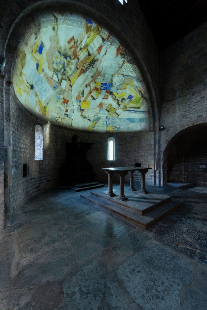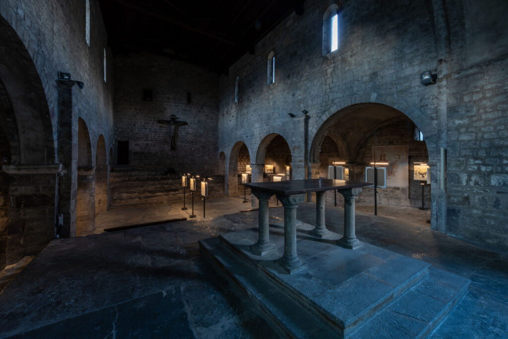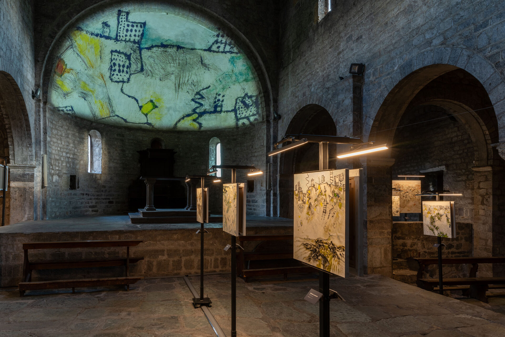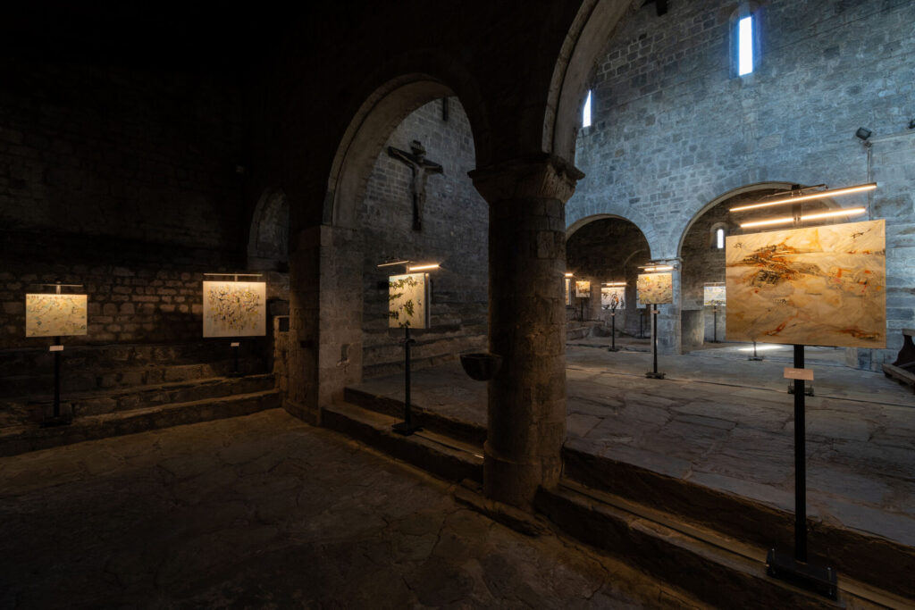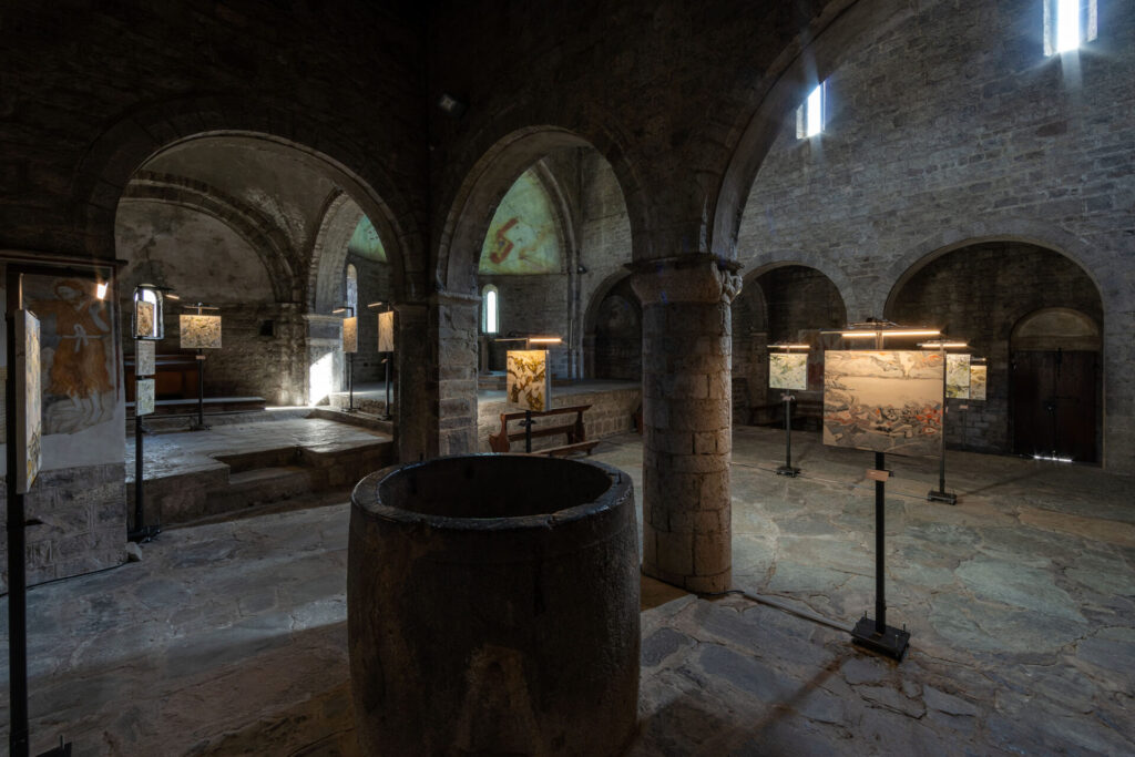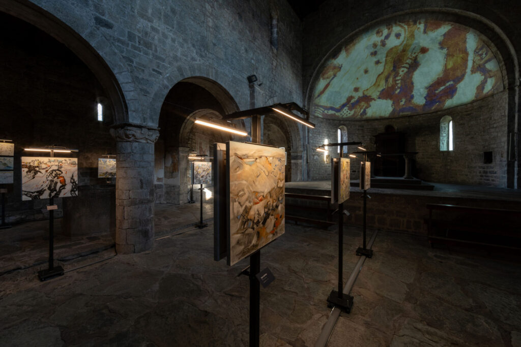 L’esposizione coniuga il linguaggio artistico contemporaneo con il patrimonio millenario dell’arte rupestre di Valle Camonica — primo Sito UNESCO in Italia — presentando 31 opere in cui Pericoli reinterpreta i segni antichi come movimenti, memorie e trasformazioni della terra. Collocare queste opere nella Pieve di San Siro, edificio romanico carico di valore storico e spirituale, non è solo scelta scenografica ma gesto ermeneutico: la pietra della chiesa, le sue ombre e la sua stratificazione storica dialogano con il segno pittorico, producendo una continuità materiale che rinforza la percezione di una storia viva e reiterata.