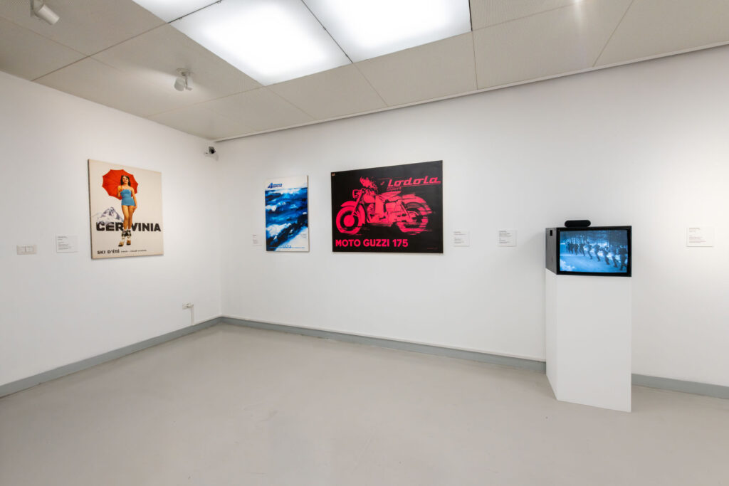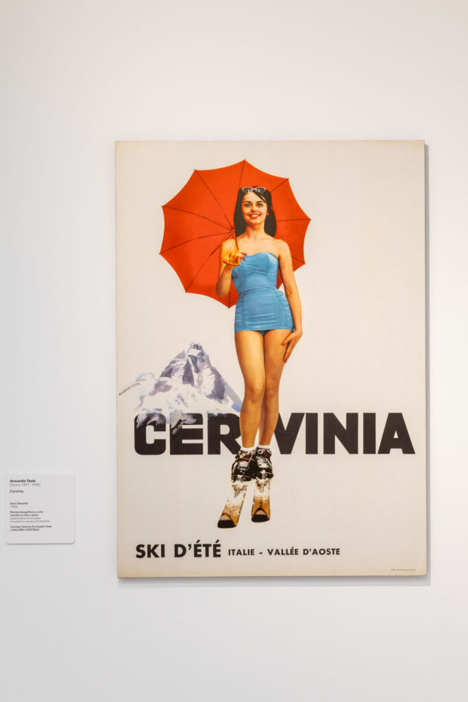 Urrà la neve! Armando Testa e lo sport evidenzia la capacità dell’artista di trasformare le pratiche sportive in metafore di cambiamenti culturali e sociali del proprio tempo. Dai primi manifesti degli anni Cinquanta, come Moto Guzzi Lodola Sport 175 (1954), in cui velocità e sintesi cromatica restituiscono il mito moderno del movimento, fino ai manifesti per i Giochi della XVII Olimpiade (1959), lo sport si afferma come simbolo di progresso e di partecipazione collettiva.