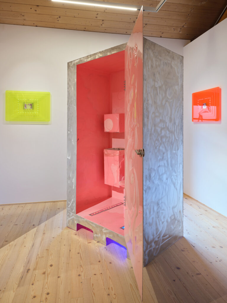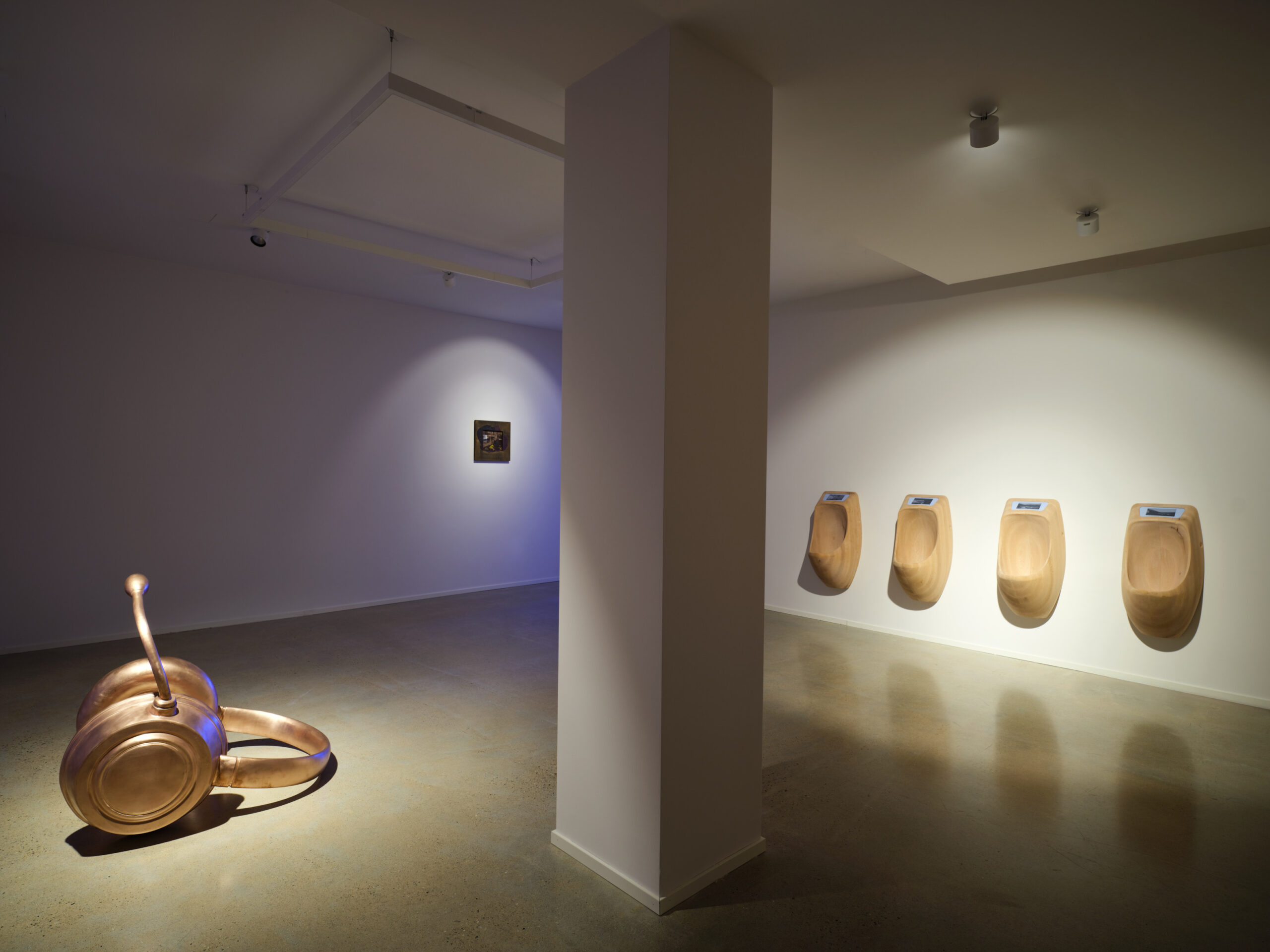 Sculture in bronzo, lavori in legno e acrilico, strutture modulari e cabine dialogano con dispositivi provenienti da ambienti di lavoro e spazi semi-pubblici — distributori d’acqua, arredi tecnici — trattati come frammenti di un sistema più ampio che promette cura attraverso il controllo, mettendo in tensione funzione e rappresentazione e rivelando la dimensione politica dei dispositivi quotidiani.