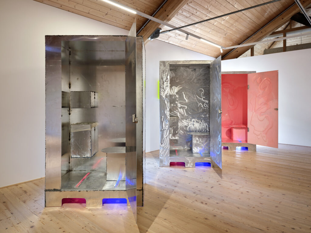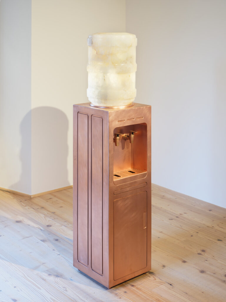 Ai piani superiori, Cabin (2024) e altre strutture modulari traducono standard e unità logistiche in architetture minime, a metà tra protezione ed esposizione, intimità e servizio. L’idea di registro e duplicazione attraversa anche opere costruite come superfici di misura e di copia, con interventi che reintroducono gesto e materia dentro dispositivi apparentemente neutri. La visita si chiude su pausa, ristoro, idratazione: Water Cooler (2026) trasforma un oggetto da ufficio in presenza scultorea e punto di incontro.