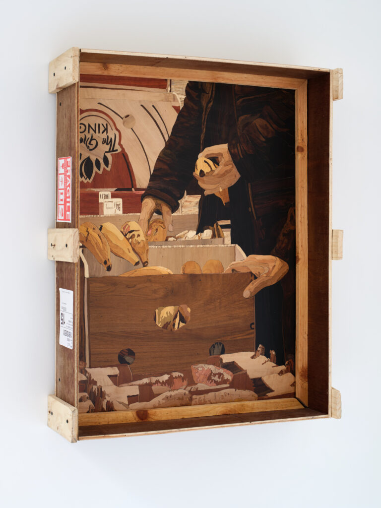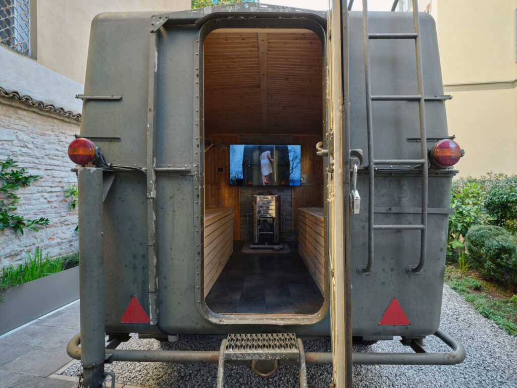 All’ingresso, opere come Just-in-time (2025) e Smooth Operator (2026) introducono il tema del comfort come costruzione regolata: cura, trasporto, controllo, con uno scarto percettivo prodotto da colore, trasparenze, replica. Al piano terra la serie di intarsi Transactions, realizzata a partire da immagini legate a filiere e gesti di lavoro, rallenta l’immaginario dell’efficienza e isola il dettaglio del contatto. Nel cortile, la Mobile Sauna (Verkstadskärra 3 – Ångenhet, 2026) concentra il progetto: una sauna ottenuta dalla riconversione di un veicolo originariamente bellico, trasportata da Andersen da Gotland, (Svezia) a Milano e restituita anche come road movie, in una dimensione performativa e processuale.