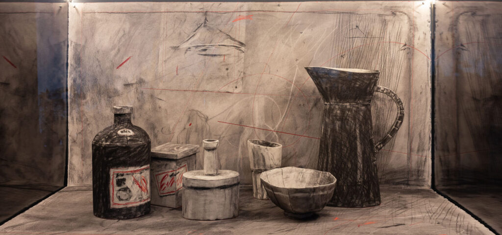 In linea con il progetto curatoriale di Metafisica/Metafisiche, l’installazione di Kentridge mette in luce l’eredità formale e concettuale di Morandi, recuperando una pratica espressiva che fa del tempo, della memoria e del ritmo una materia visiva.