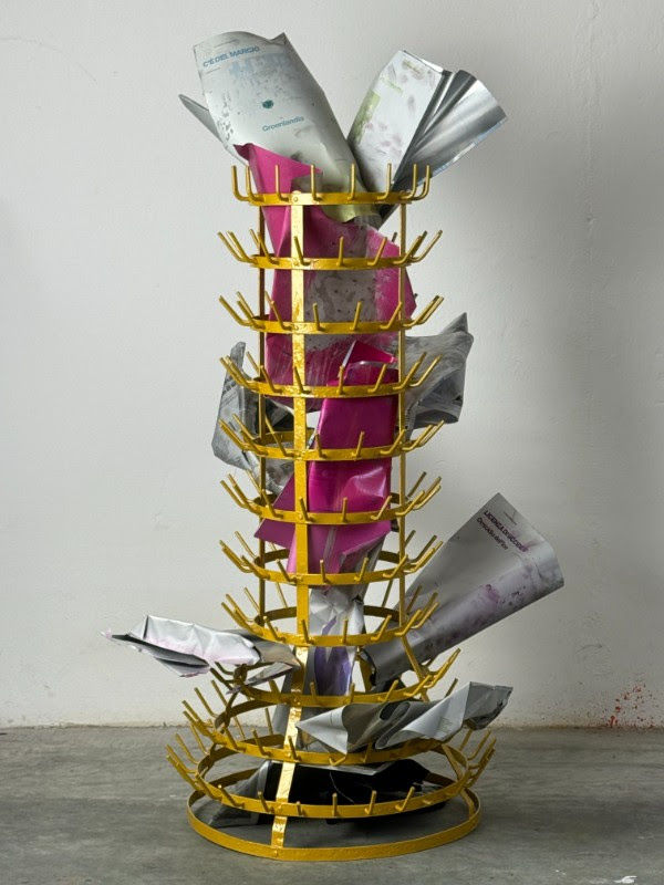 Accanto ai cicli storici, la mostra presenta un’installazione inedita che si confronta con il lascito di Marcel Duchamp, in particolare con il celebre scolabottiglie. Il riferimento al ready-made duchampiano non si configura come semplice citazione, ma come dispositivo critico: Colin rilegge quel gesto fondativo alla luce dell’odierno ecosistema mediatico, interrogando il passaggio dall’oggetto all’immagine come luogo privilegiato di attribuzione di senso e valore.