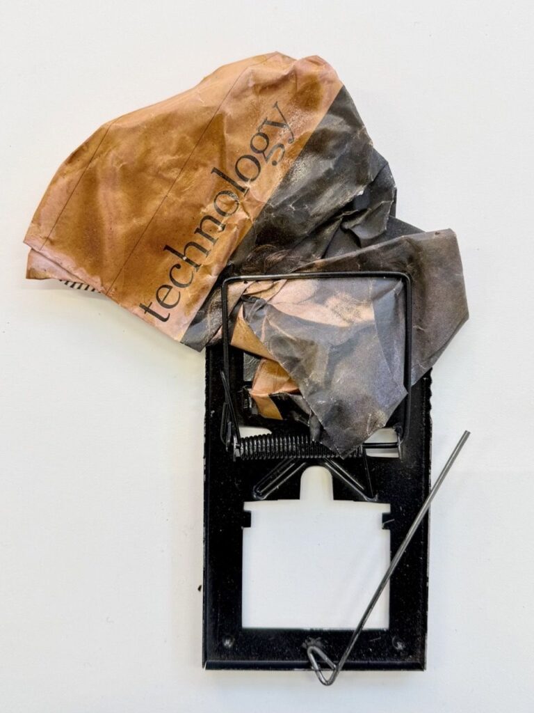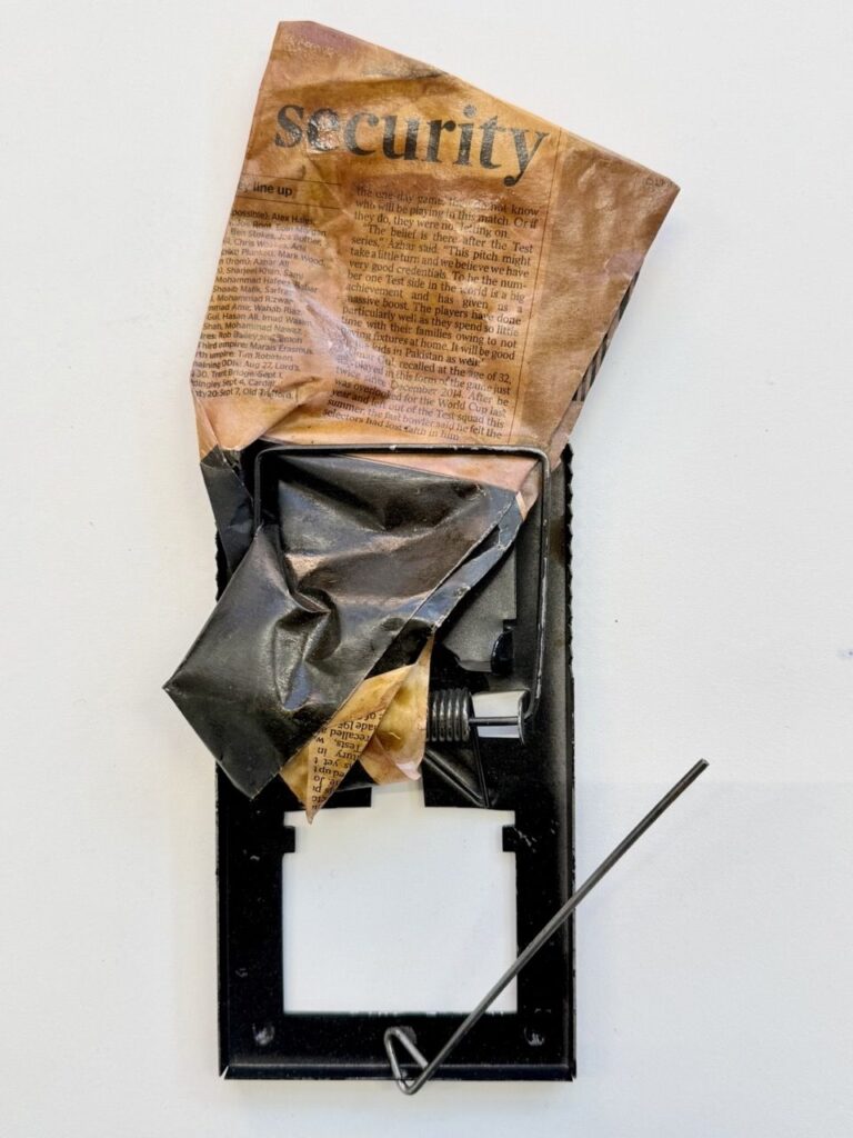 Fondante per Colin è l’intervento su materiali provenienti dal sistema editoriale – quotidiani, immagini di cronaca, riproduzioni – che sottopone a processi di manipolazione fisica e visiva: piegature, compressioni, cancellazioni e sovrapposizioni che ne alterano la leggibilità originaria. Attraverso tali operazioni, l’immagine perde la sua funzione documentaria immediata per acquisire una nuova dimensione, più densa e riflessiva, che si sottrae al tempo istantaneo dell’informazione.